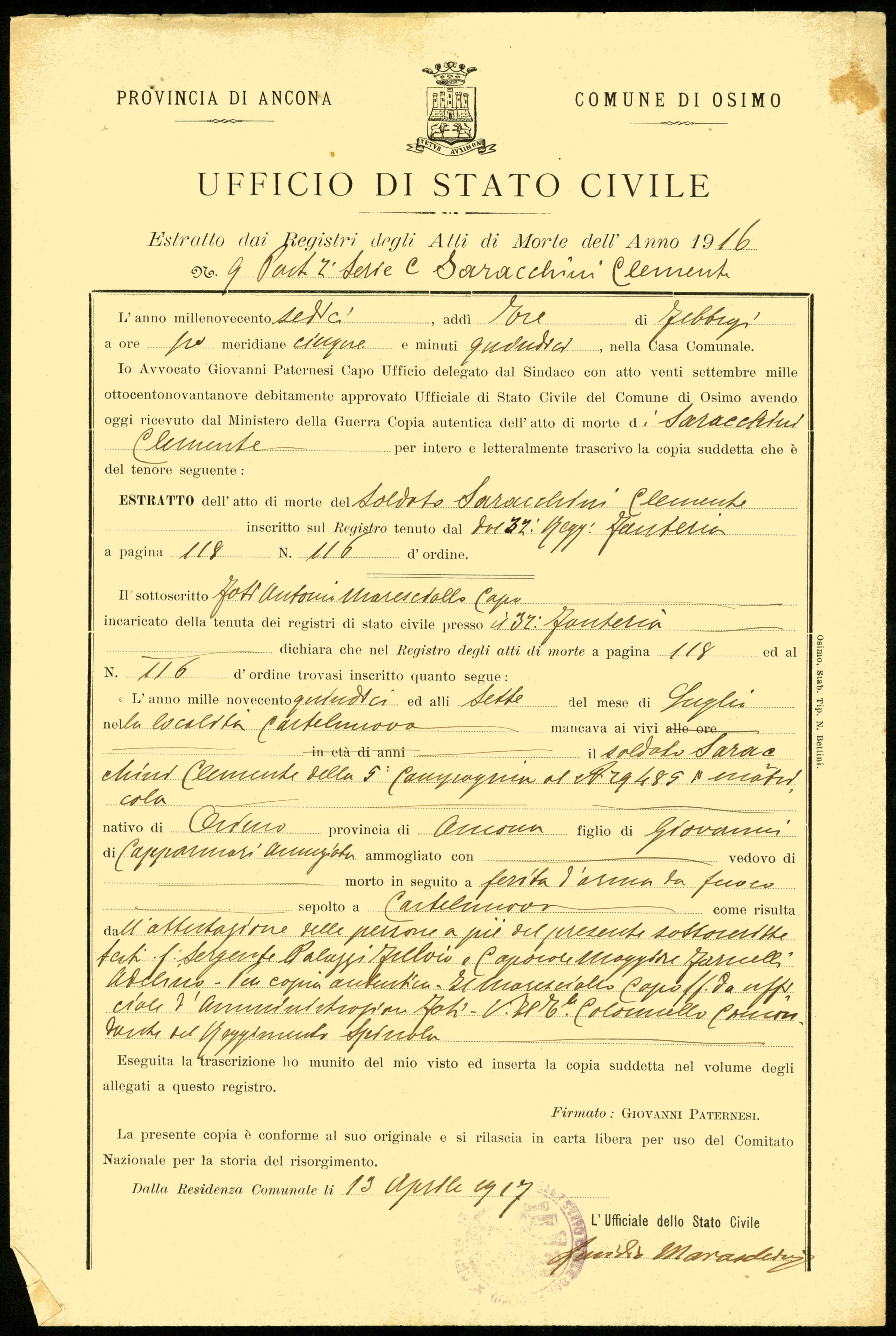 | Percorso: Istituto per la Storia del Risorgimento Italian.../Fondo caduti prima guerra mondiale/Santucci Angelo - Sarasino Silvestro/Saracchini Clemente, Osimo (Ancona) | |||||||||||