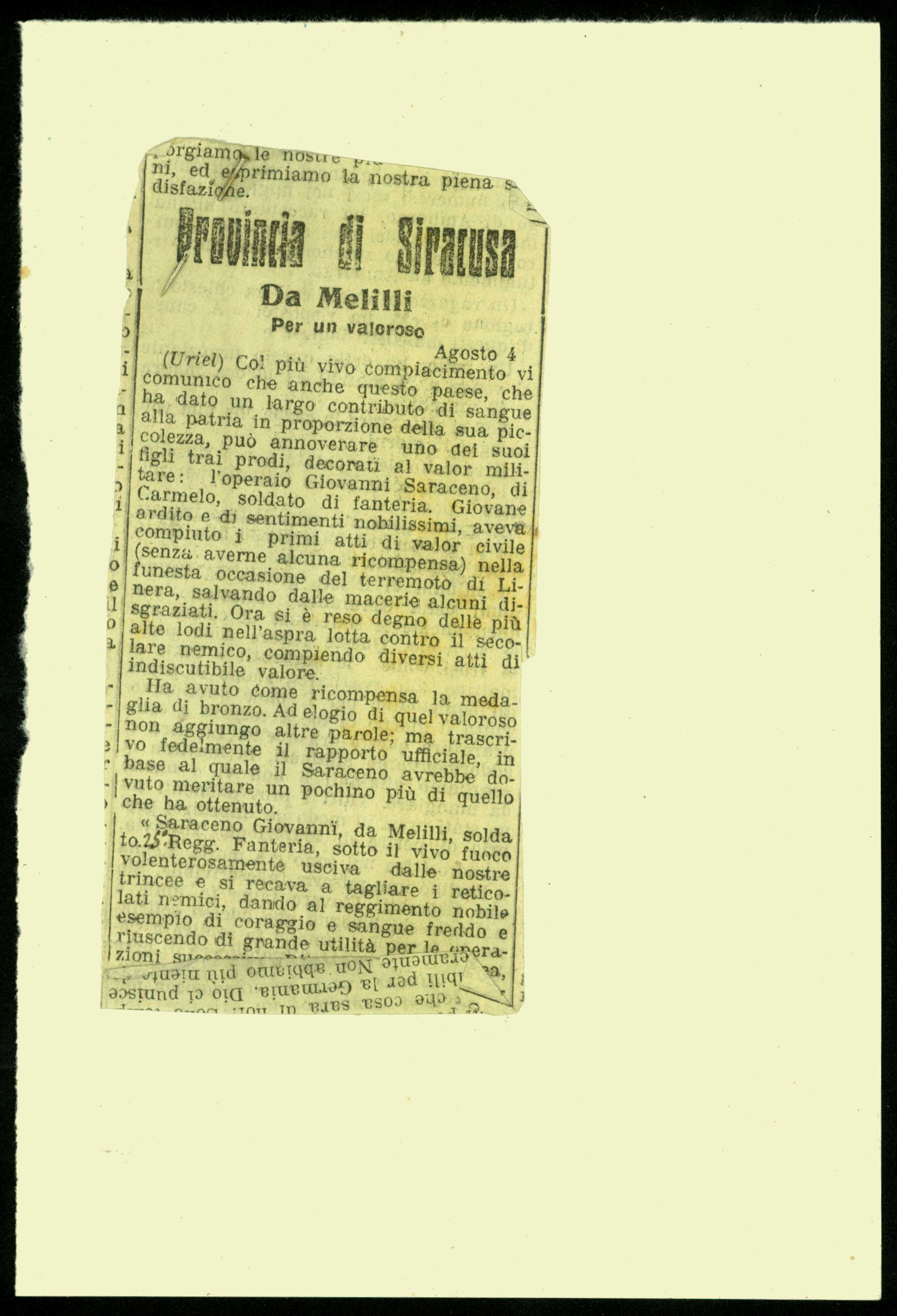 | Percorso: Istituto per la Storia del Risorgimento Italian.../Fondo caduti prima guerra mondiale/Santucci Angelo - Sarasino Silvestro/Saraceno Giovanni, Melilli (Siracusa) | |||||||||||