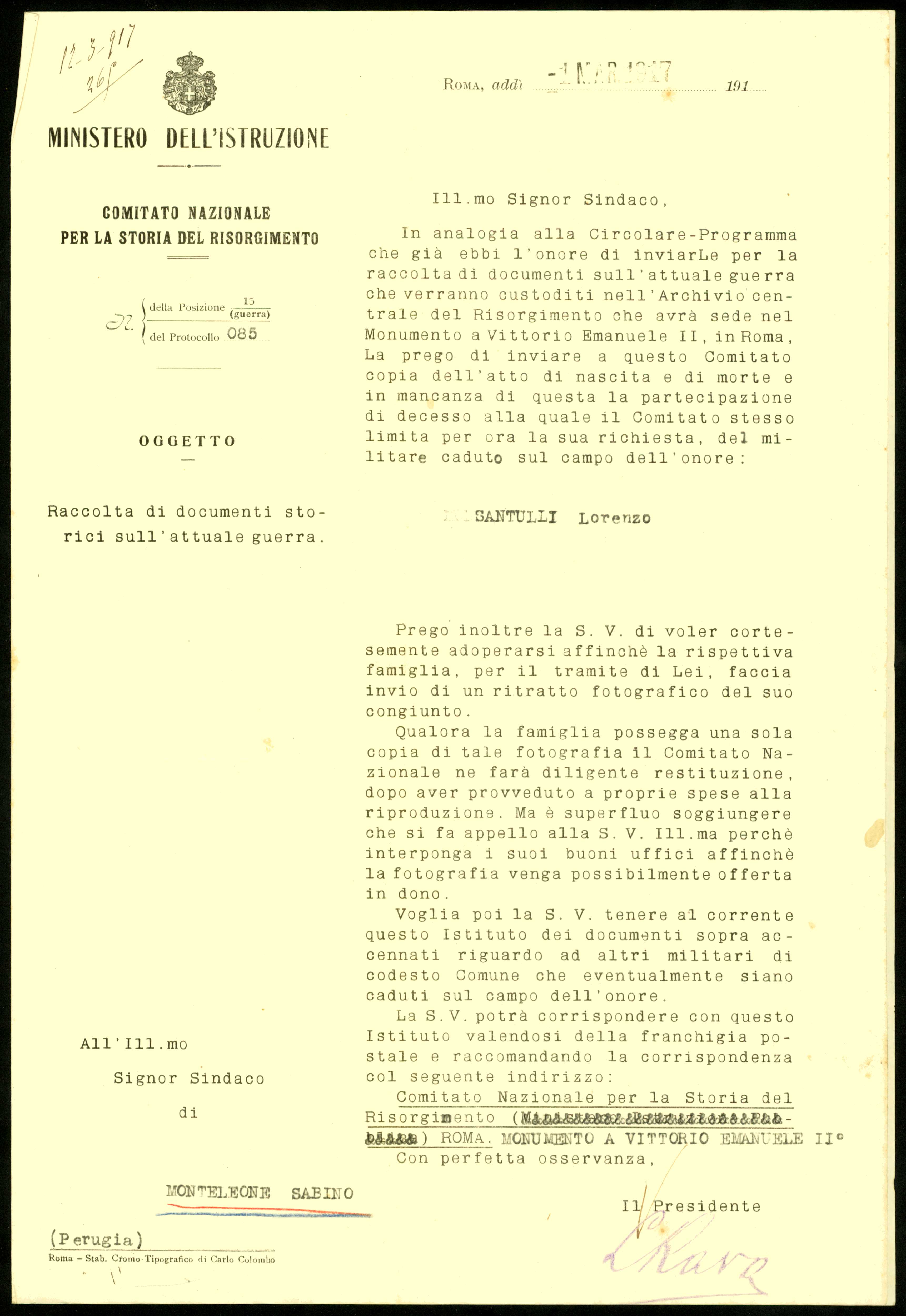 Istituto per la Storia del Risorgimento Italian.../Fondo caduti prima guerra mondiale/Santucci Angelo - Sarasino Silvestro/Santulli Lorenzo, Monteleone