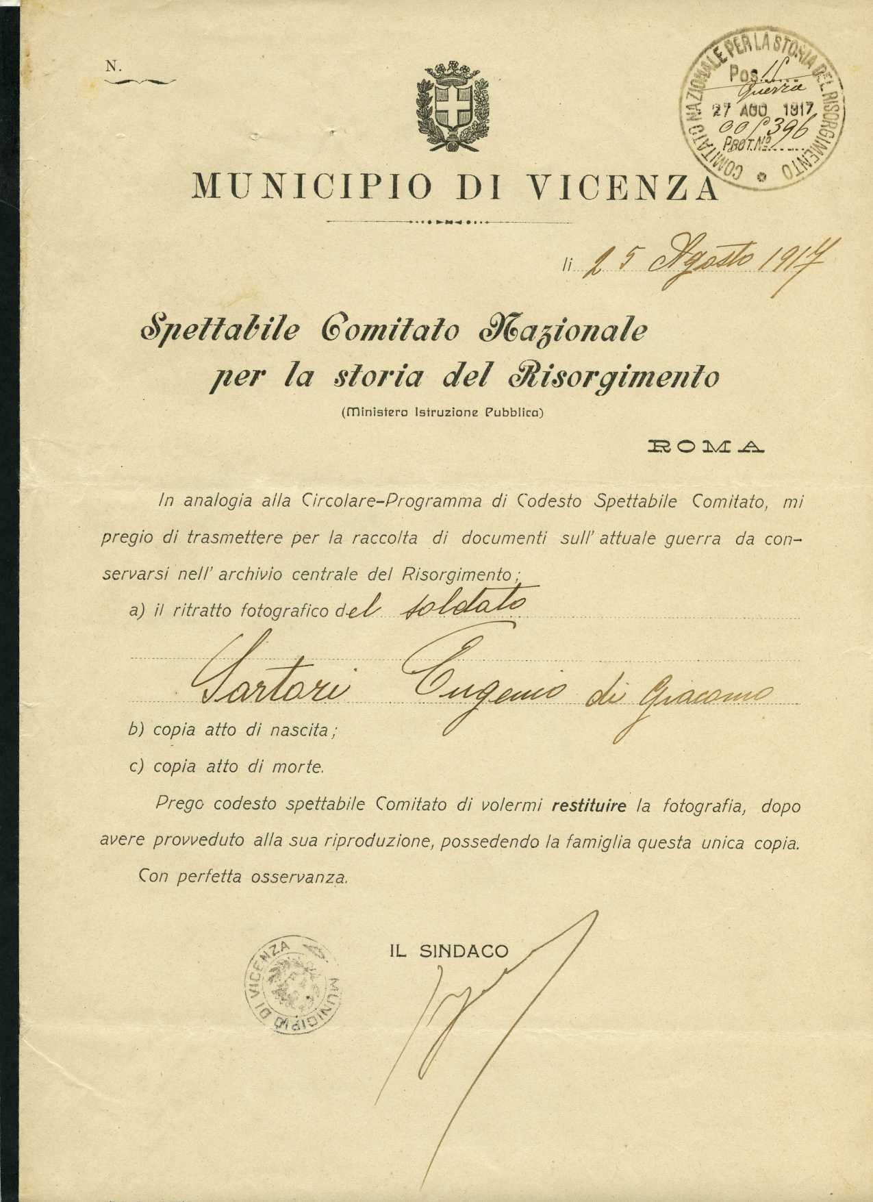 | Percorso: Istituto per la Storia del Risorgimento Italian.../Fondo caduti prima guerra mondiale/Sarchielli Alfredo - Sarzetti Alfredo/Sartori Eugenio, Montegalda (Vicenza) | |||||||||||