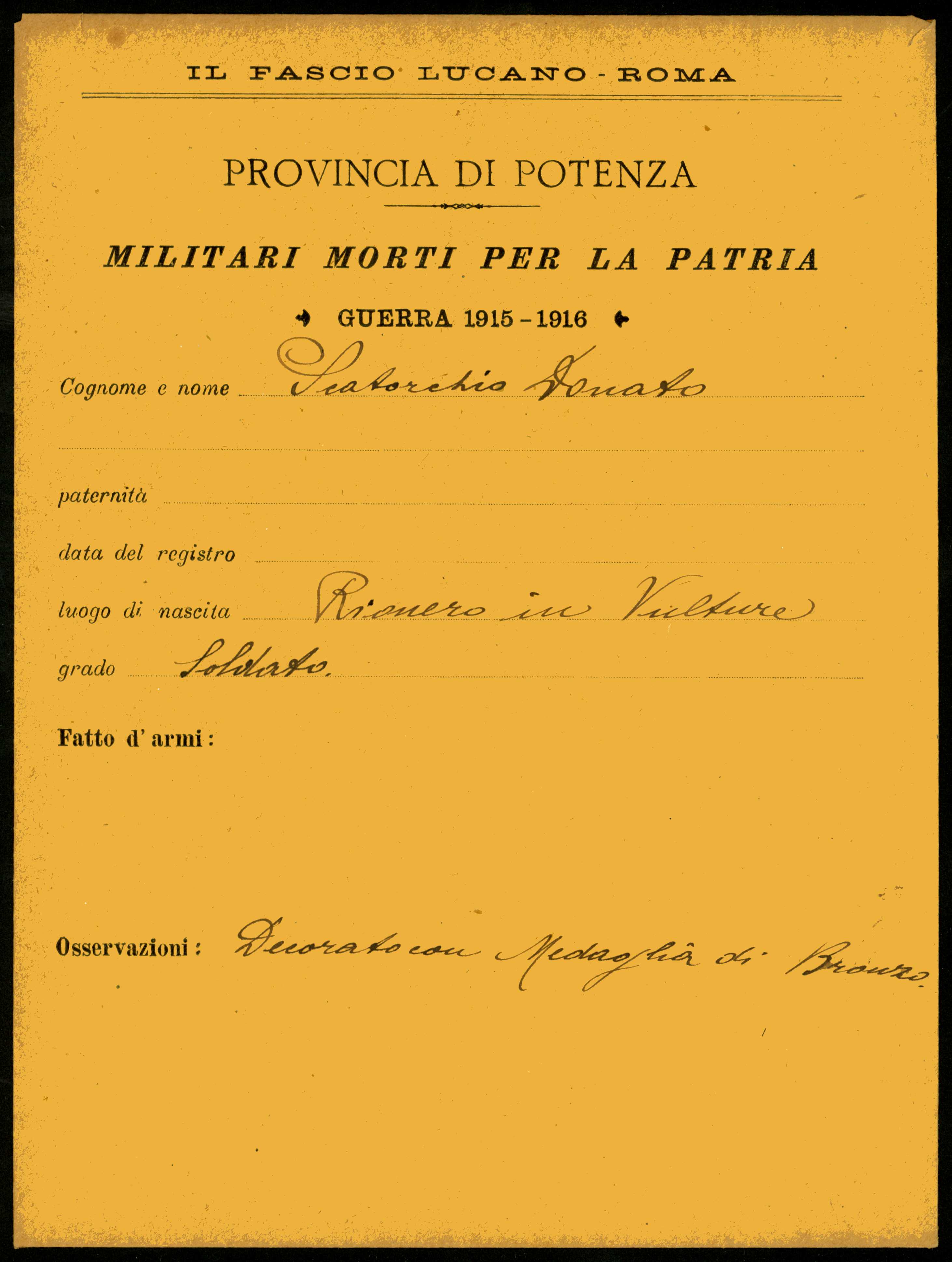 Percorso: Istituto per la Storia del Risorgimento Italian.../Fondo caduti prima guerra mondiale/Scarrone Leone - Scherl Guglielmo/Scatorchio Donato, Rionero in Vulture (Potenza)
