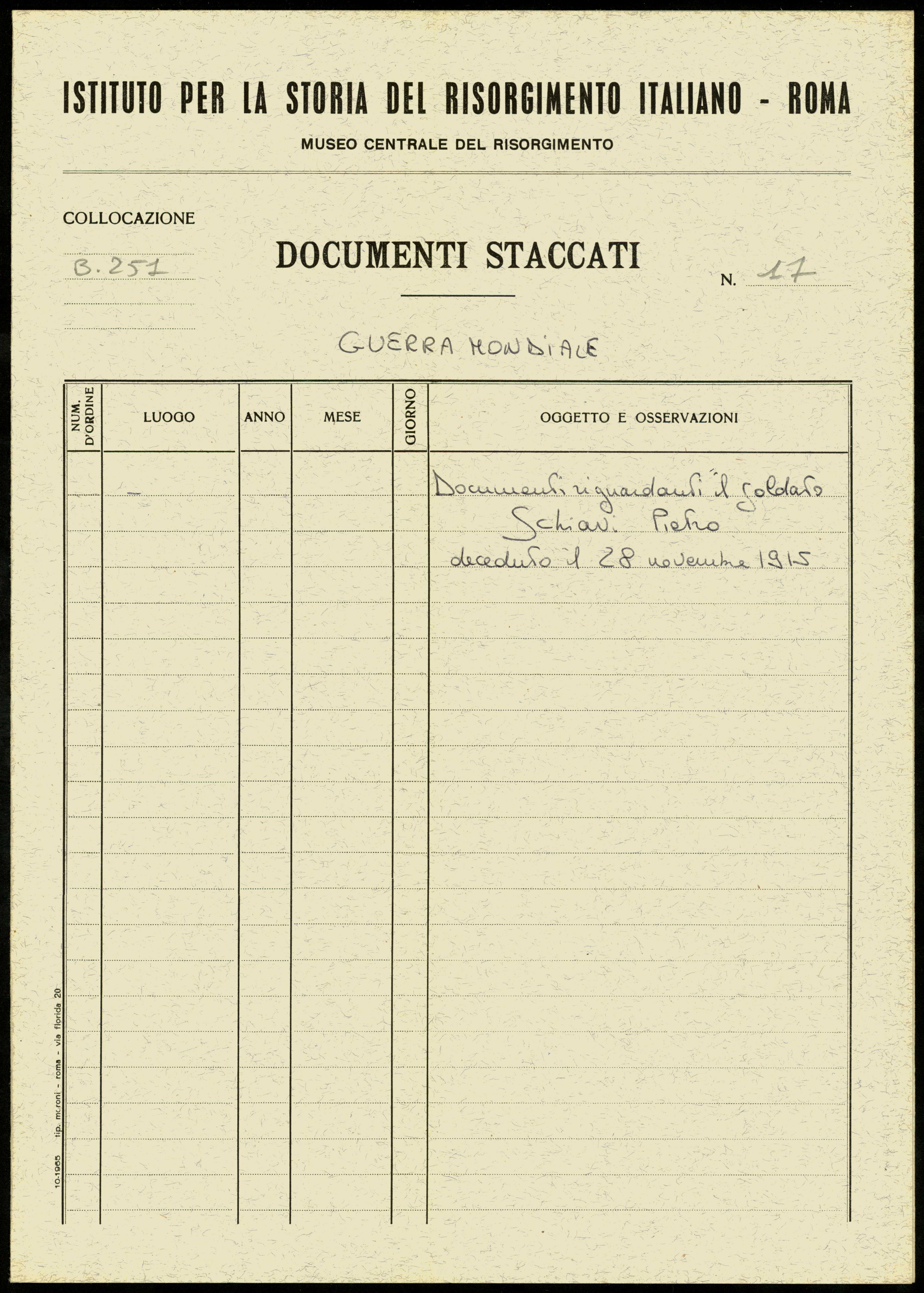 | Percorso: Istituto per la Storia del Risorgimento Italian.../Fondo caduti prima guerra mondiale/Schiani Augusto - Schipani Ciro/Schiavi Pietro, San Colombano al Lambro (Milano) | |||||||||||