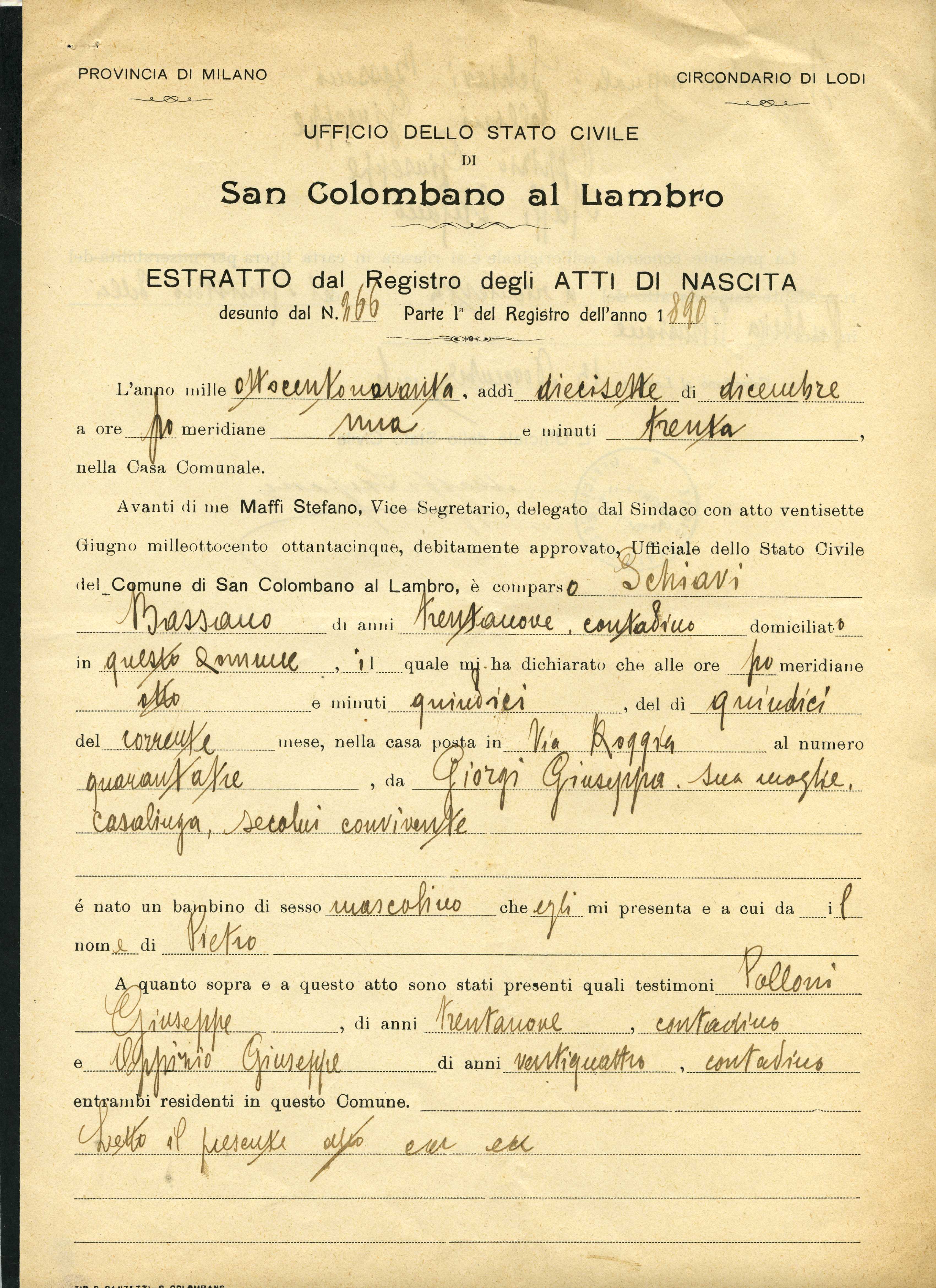 | Percorso: Istituto per la Storia del Risorgimento Italian.../Fondo caduti prima guerra mondiale/Schiani Augusto - Schipani Ciro/Schiavi Pietro, San Colombano al Lambro (Milano) | |||||||||||