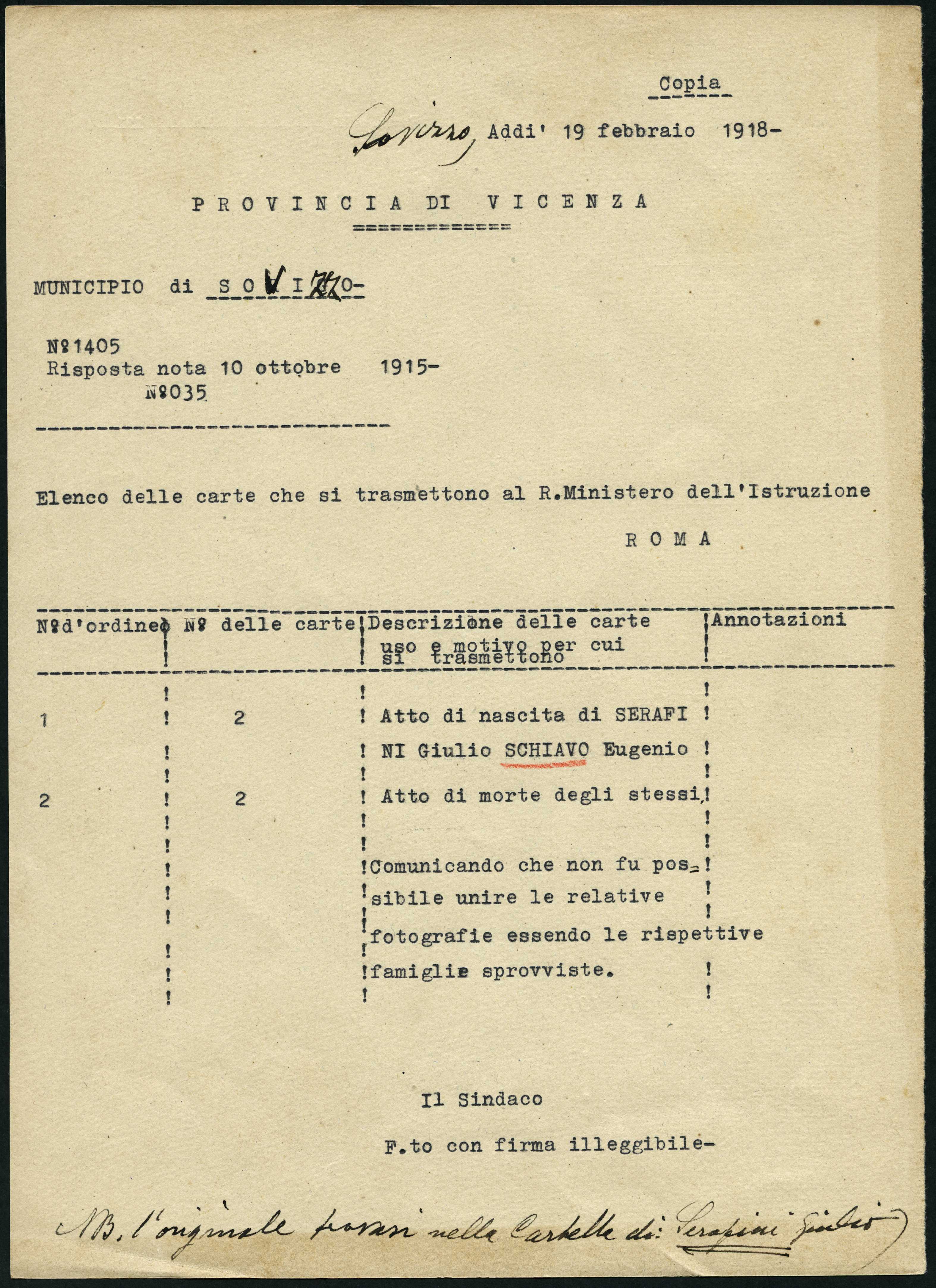 Istituto per la Storia del Risorgimento Italian.../Fondo caduti prima guerra mondiale/Schiani Augusto - Schipani Ciro/Schiavo Eugenio, Castelgomberto