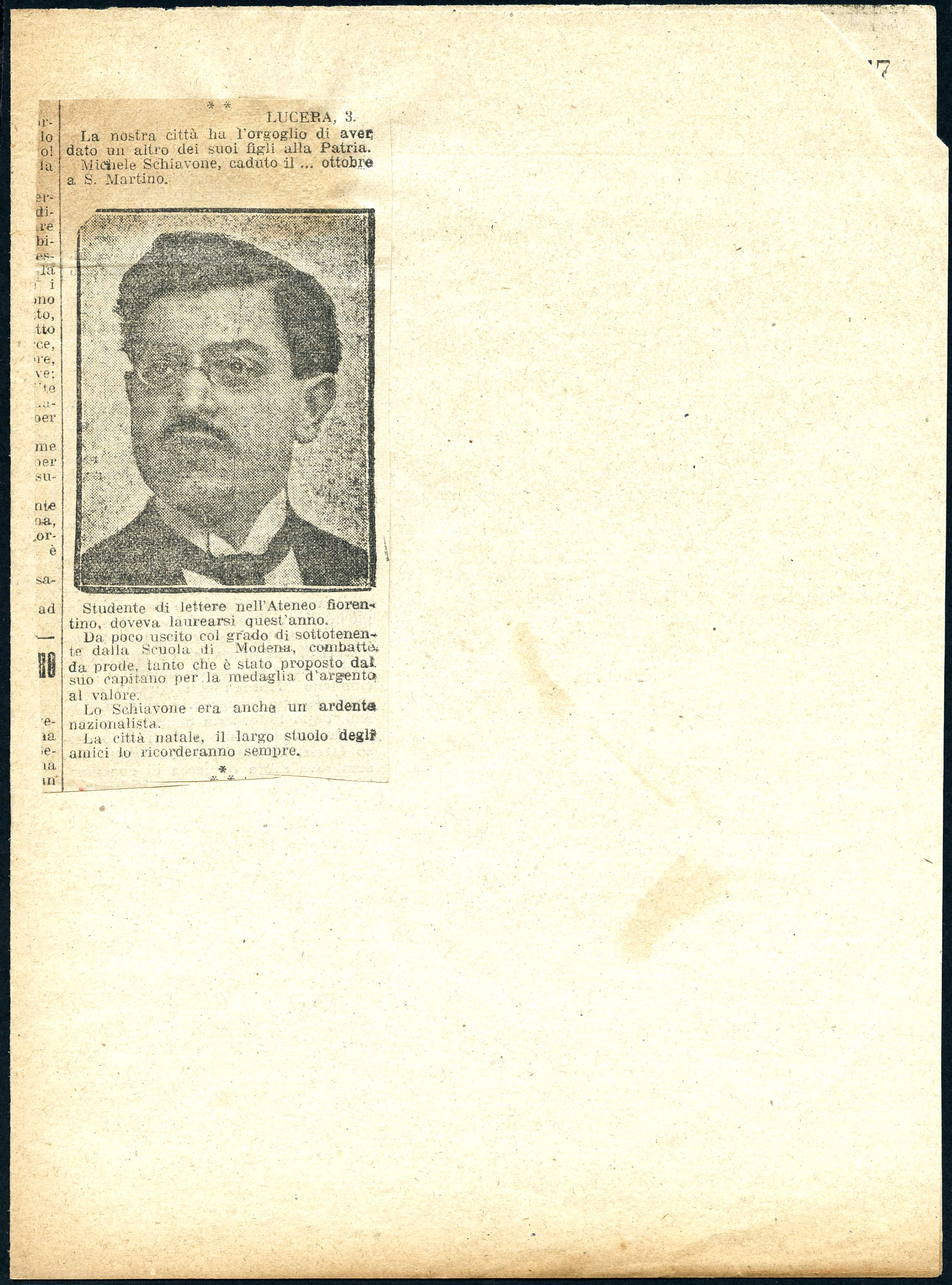 Istituto per la Storia del Risorgimento Italian.../Fondo caduti prima guerra mondiale/Schiani Augusto - Schipani Ciro/Schiavone Michele, Lucera (Foggia)