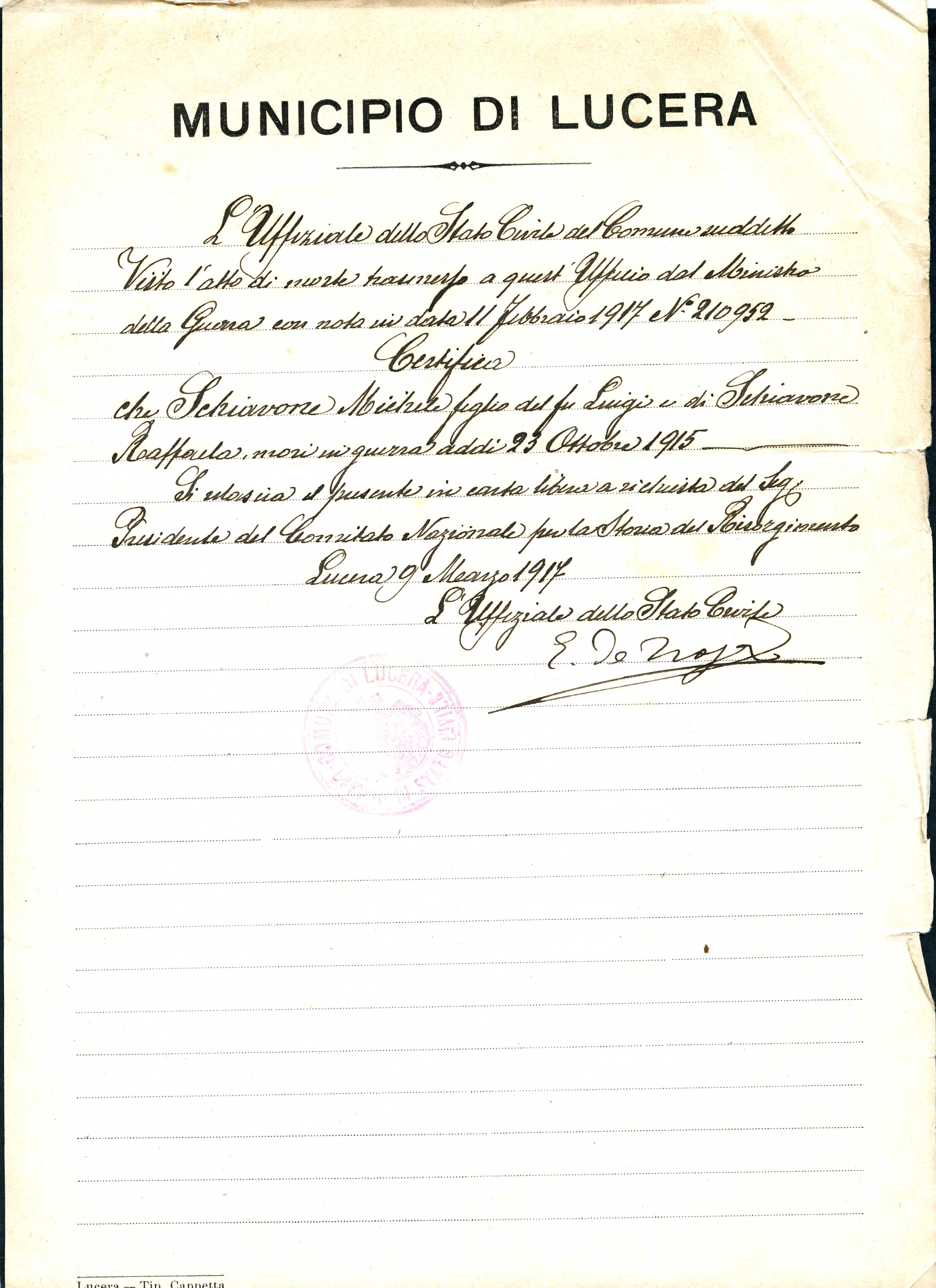 Istituto per la Storia del Risorgimento Italian.../Fondo caduti prima guerra mondiale/Schiani Augusto - Schipani Ciro/Schiavone Michele, Lucera (Foggia)
