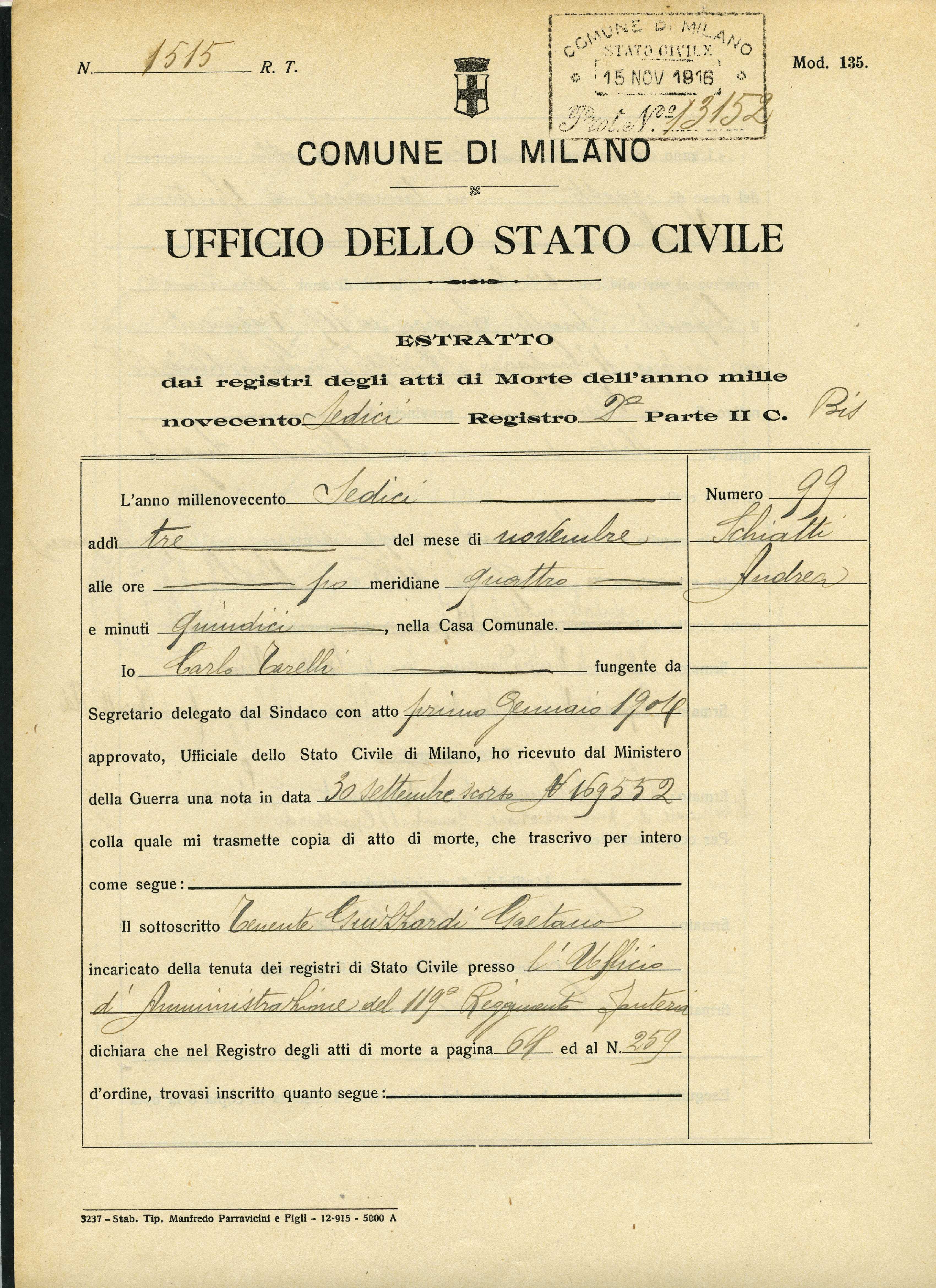 Istituto per la Storia del Risorgimento Italian.../Fondo caduti prima guerra mondiale/Schiani Augusto - Schipani Ciro/Schiatti Andrea, Milano