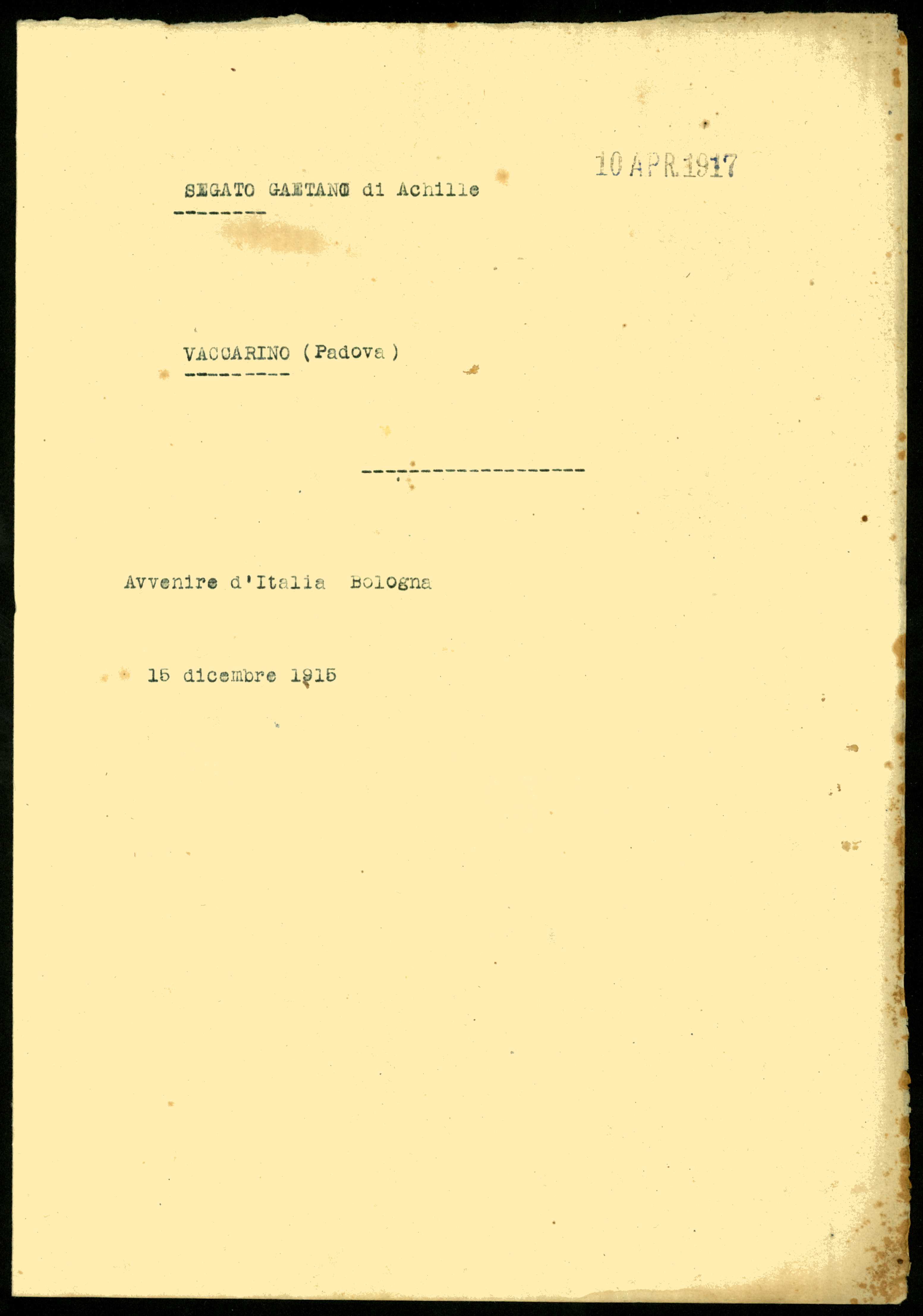 Percorso: Istituto per la Storia del Risorgimento Italian.../Fondo caduti prima guerra mondiale/Sebastiani Antonio - Selmin Alessandro/Segato Gaetano, Vaccarino (Padova)