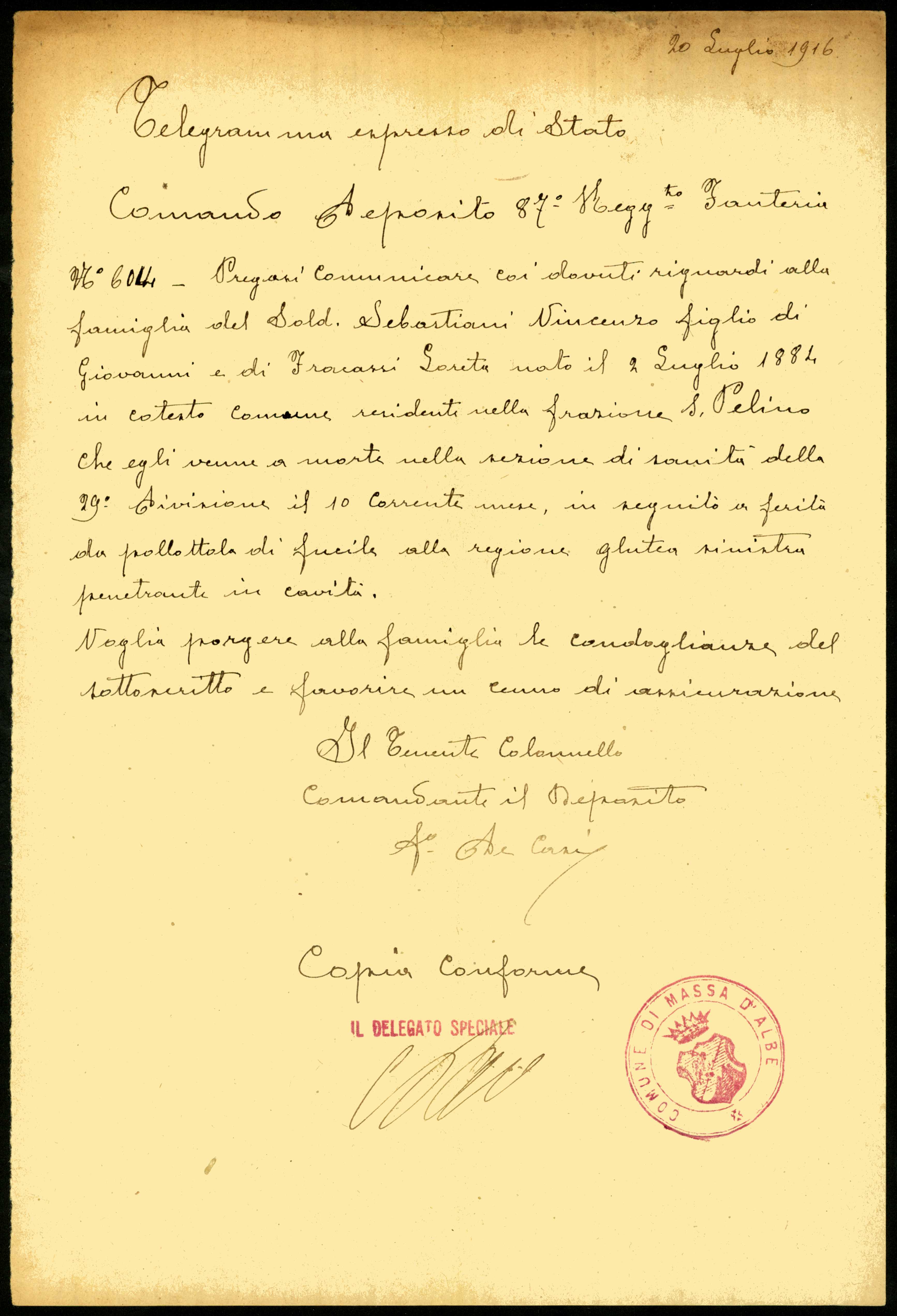 | Percorso: Istituto per la Storia del Risorgimento Italian.../Fondo caduti prima guerra mondiale/Sebastiani Antonio - Selmin Alessandro/Sebastiani Vincenzo, Massa d'Albe | |||||||||||