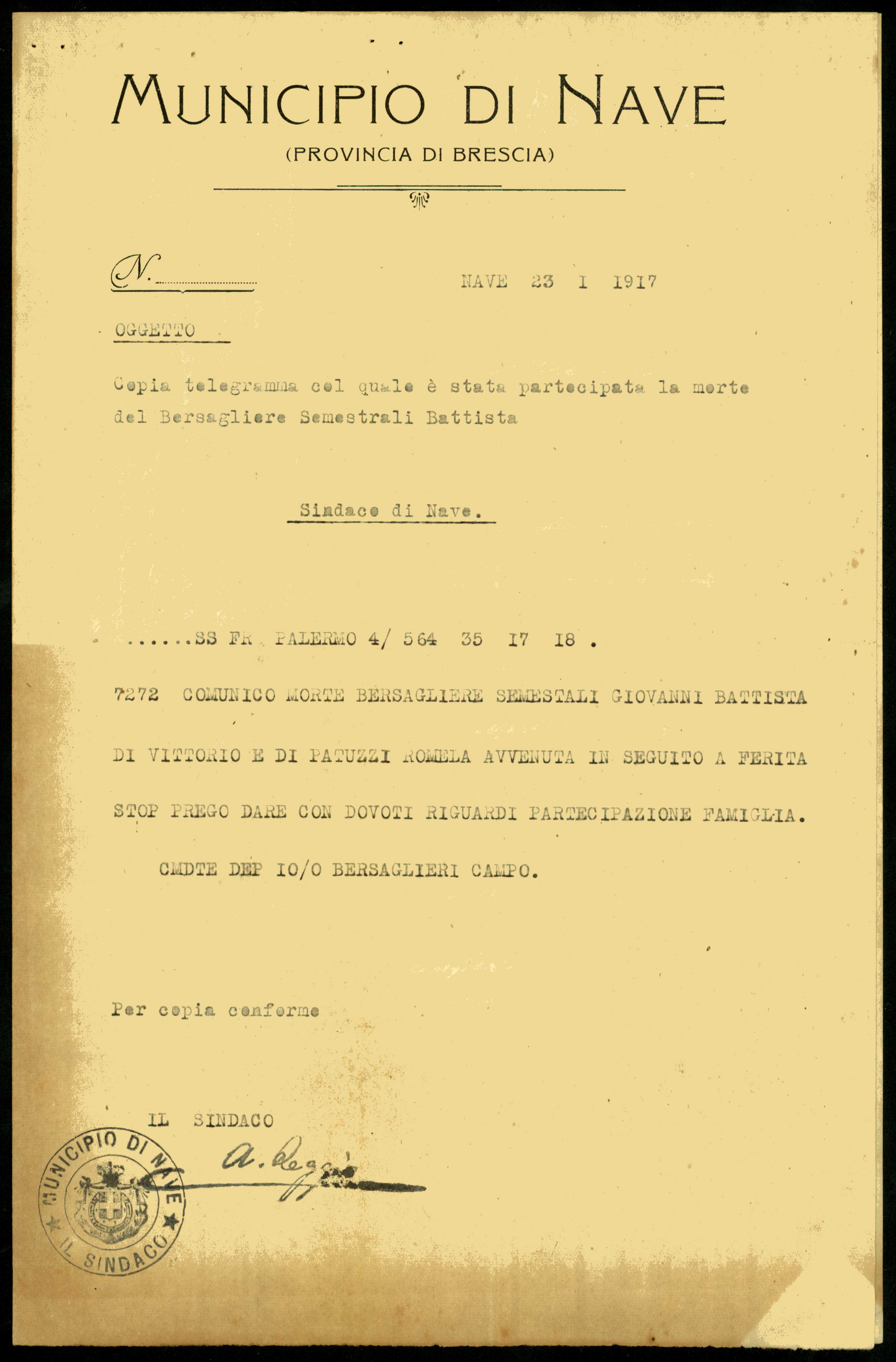| Percorso: Istituto per la Storia del Risorgimento Italian.../Fondo caduti prima guerra mondiale/Selva Attilio - Serasini Giuseppe/Semestrali Giovanni Battista, Nave (Brescia) | |||||||||||