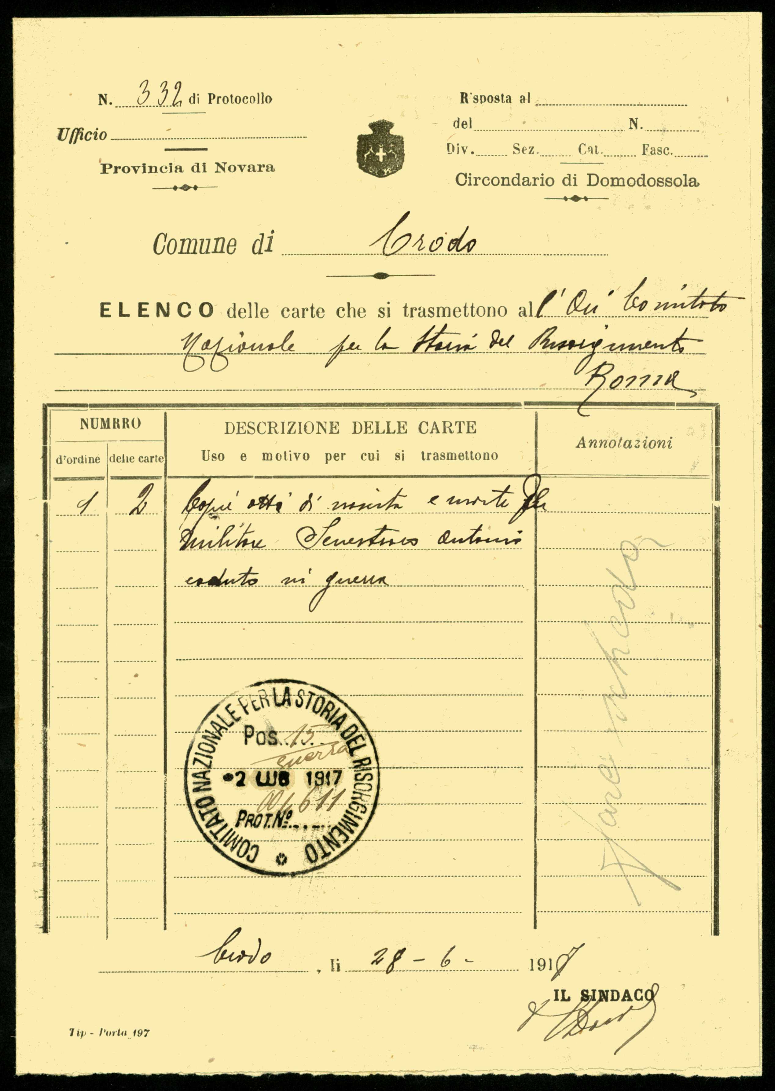 Istituto per la Storia del Risorgimento Italian.../Fondo caduti prima guerra mondiale/Selva Attilio - Serasini Giuseppe/Senestraro Antonio, Crodo (Novara)