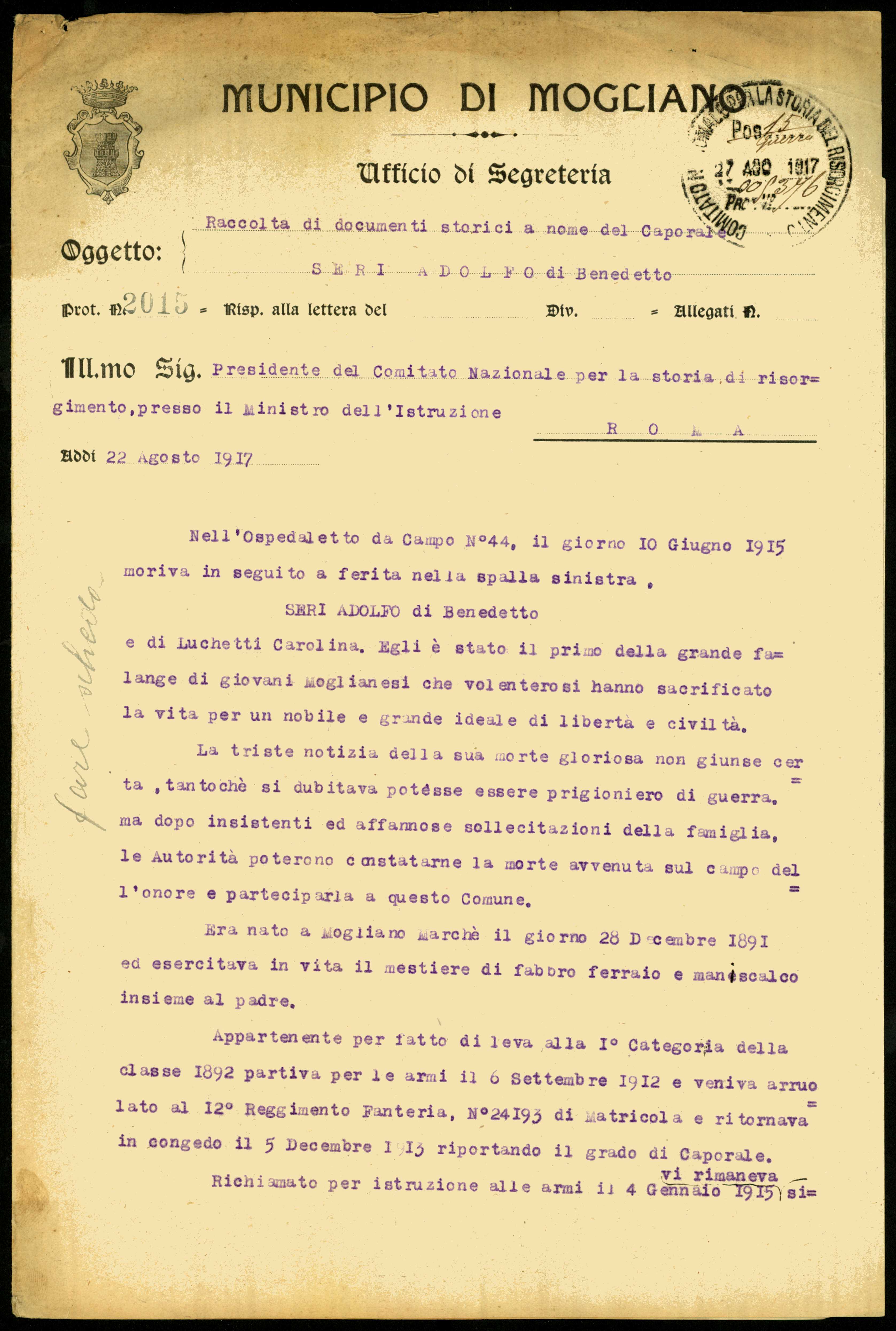 Istituto per la Storia del Risorgimento Italian.../Fondo caduti prima guerra mondiale/Serbini Mario - Serravallo Jacopo /Seri Adolfo, Mogliano