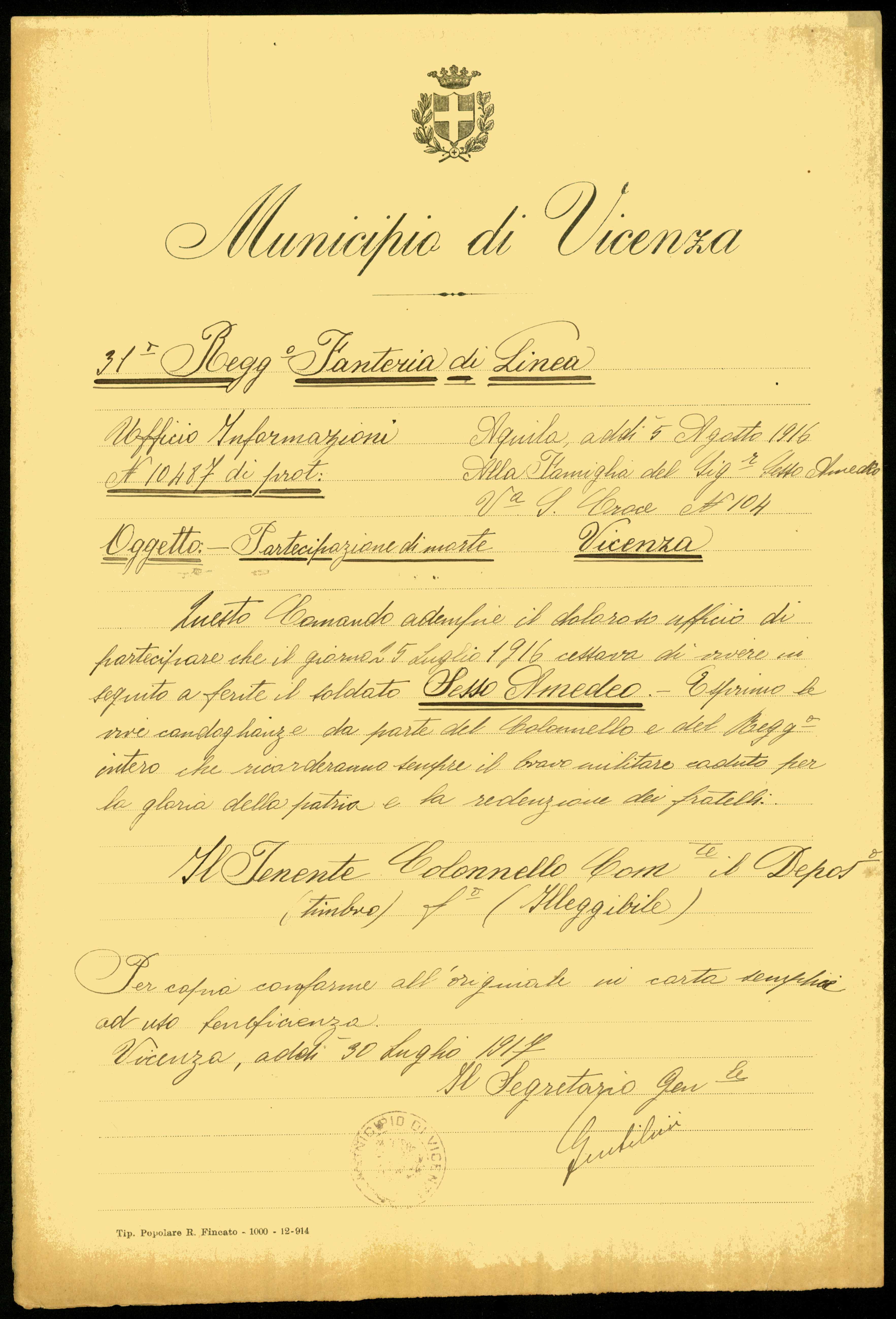 | Percorso: Istituto per la Storia del Risorgimento Italian.../Fondo caduti prima guerra mondiale/Serre Pietro - Sfriso Bartolomeo/Sesso Amedeo, Camisano Vicentino (Vicenza) | |||||||||||