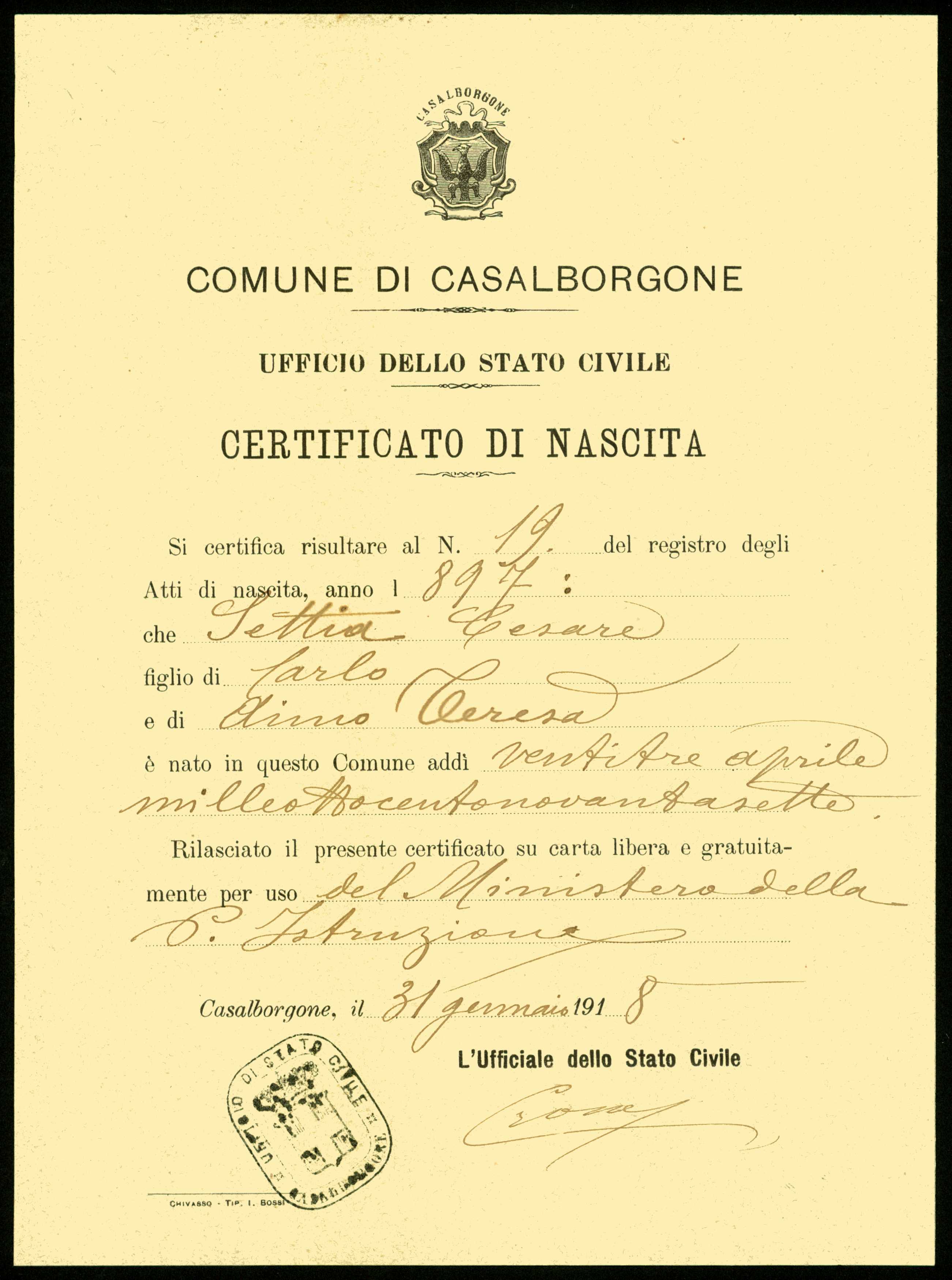 Istituto per la Storia del Risorgimento Italian.../Fondo caduti prima guerra mondiale/Serre Pietro - Sfriso Bartolomeo/Settia Cesare, Casalborgone