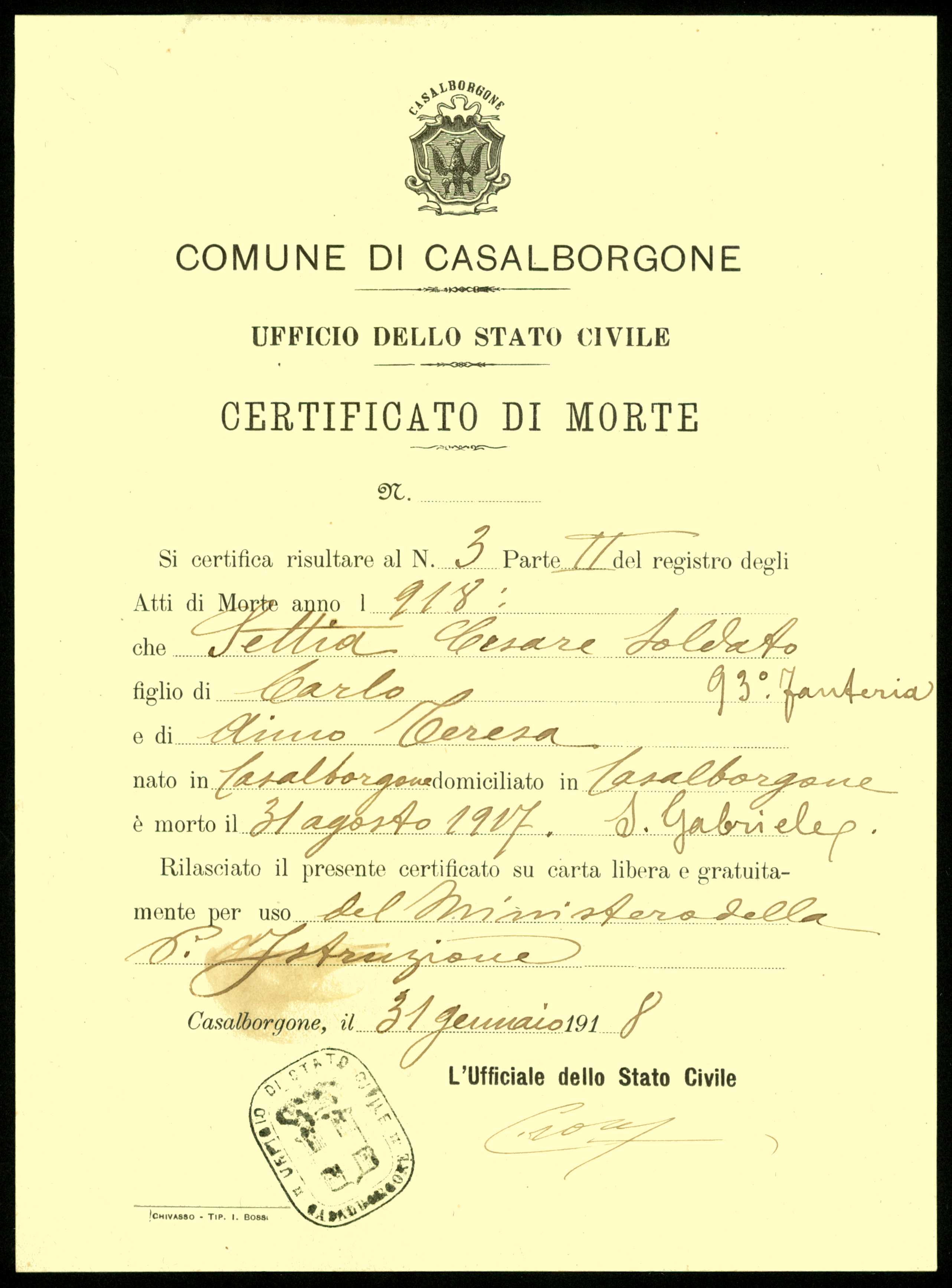 Istituto per la Storia del Risorgimento Italian.../Fondo caduti prima guerra mondiale/Serre Pietro - Sfriso Bartolomeo/Settia Cesare, Casalborgone
