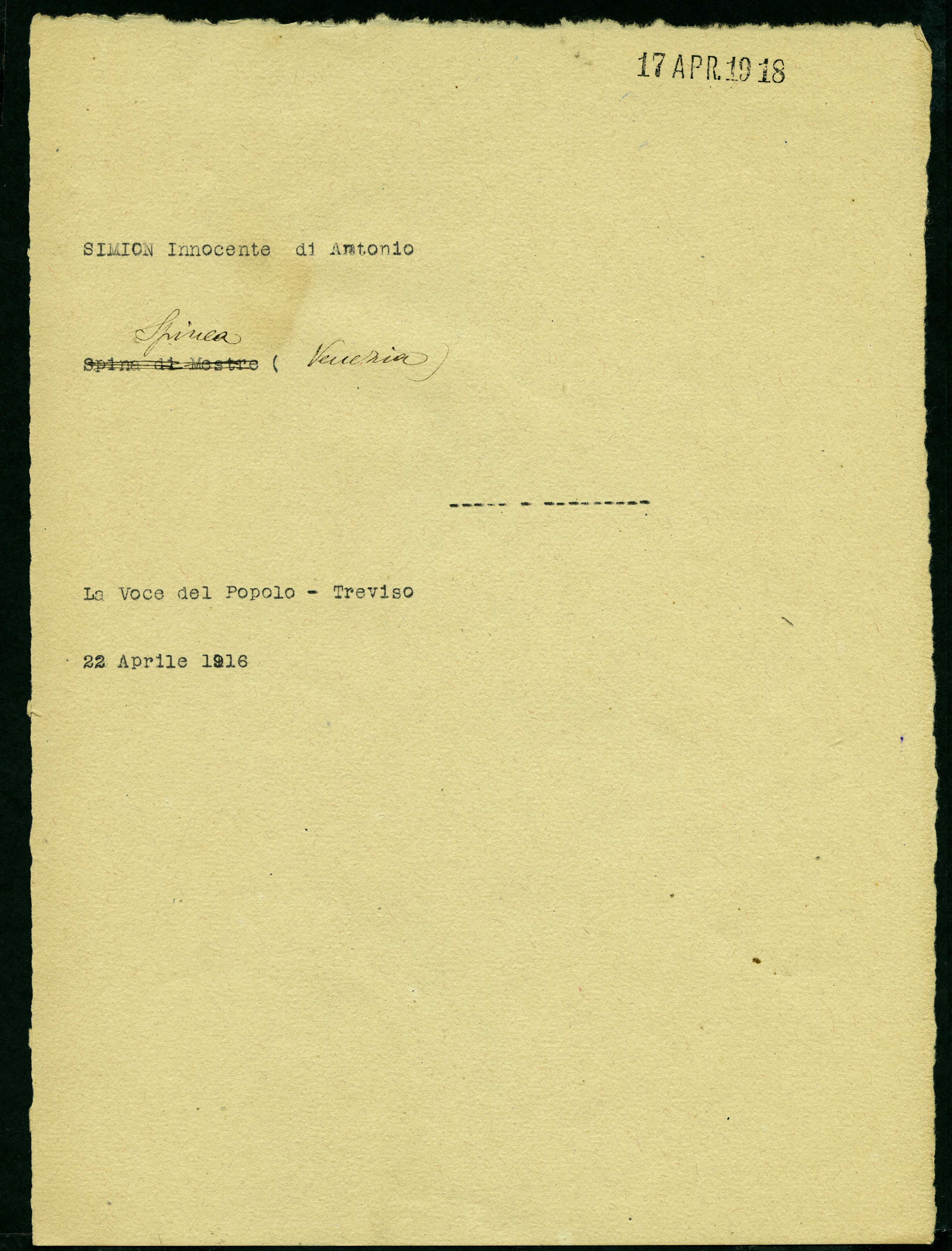 Documento: Simion Innocente, Spinea (Venezia)