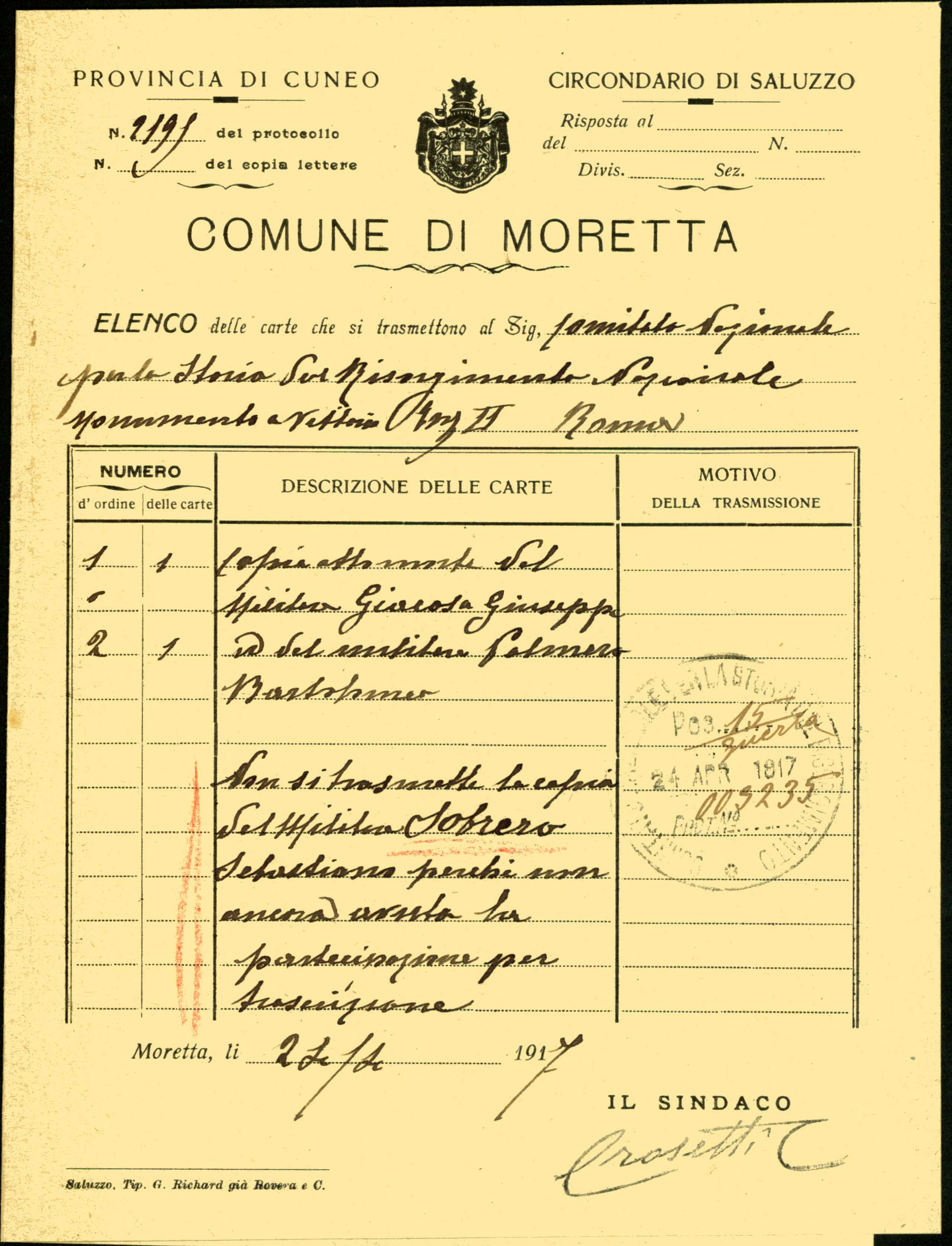 Istituto per la Storia del Risorgimento Italian.../Fondo caduti prima guerra mondiale/Smaldone Giuseppe - Soldo Luciano/Sobrero Sebastiano, Moretta (Cuneo)