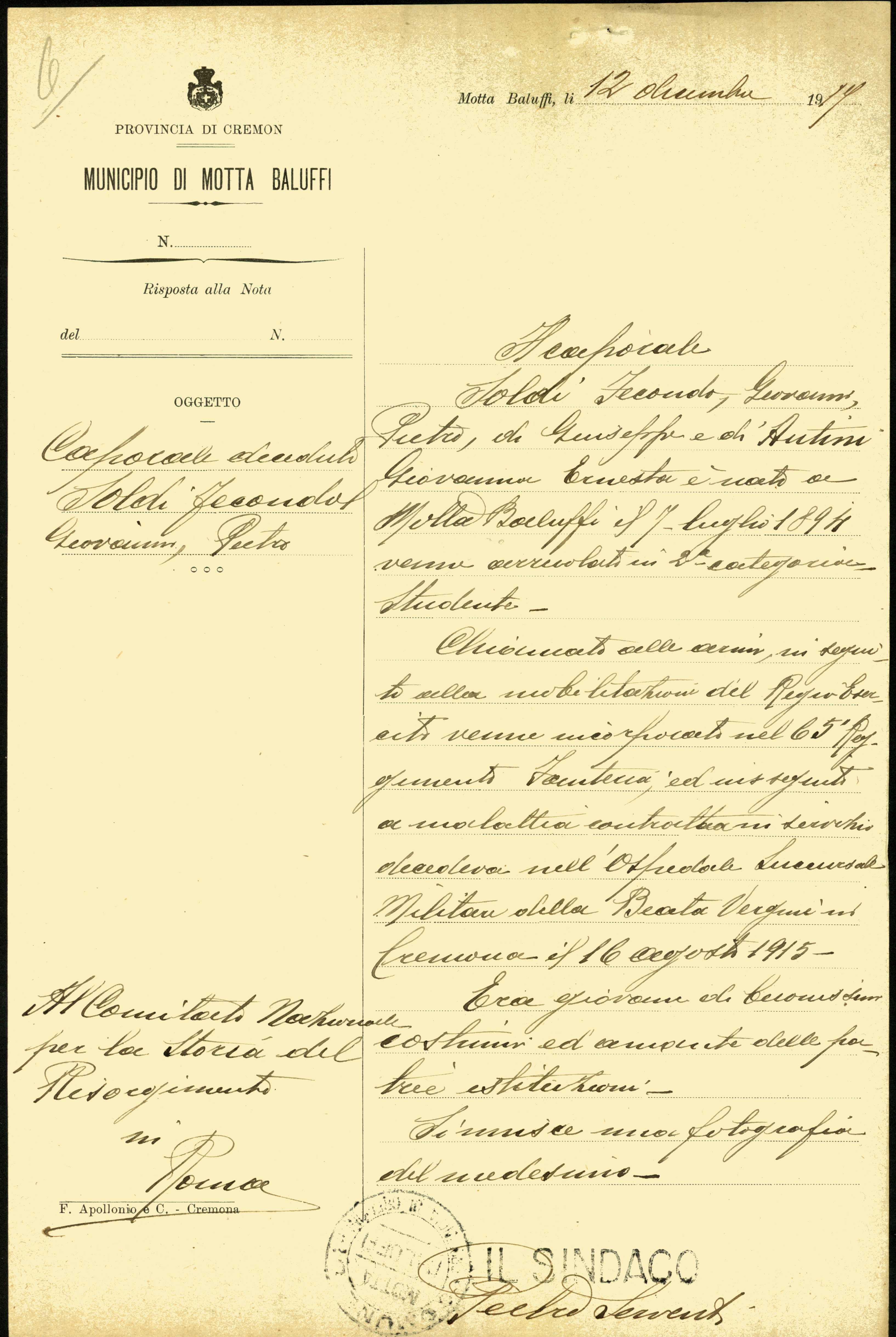 Percorso: Istituto per la Storia del Risorgimento Italian.../Fondo caduti prima guerra mondiale/Smaldone Giuseppe - Soldo Luciano/Soldi Fecondo, Motta Baluffi (Cremona)