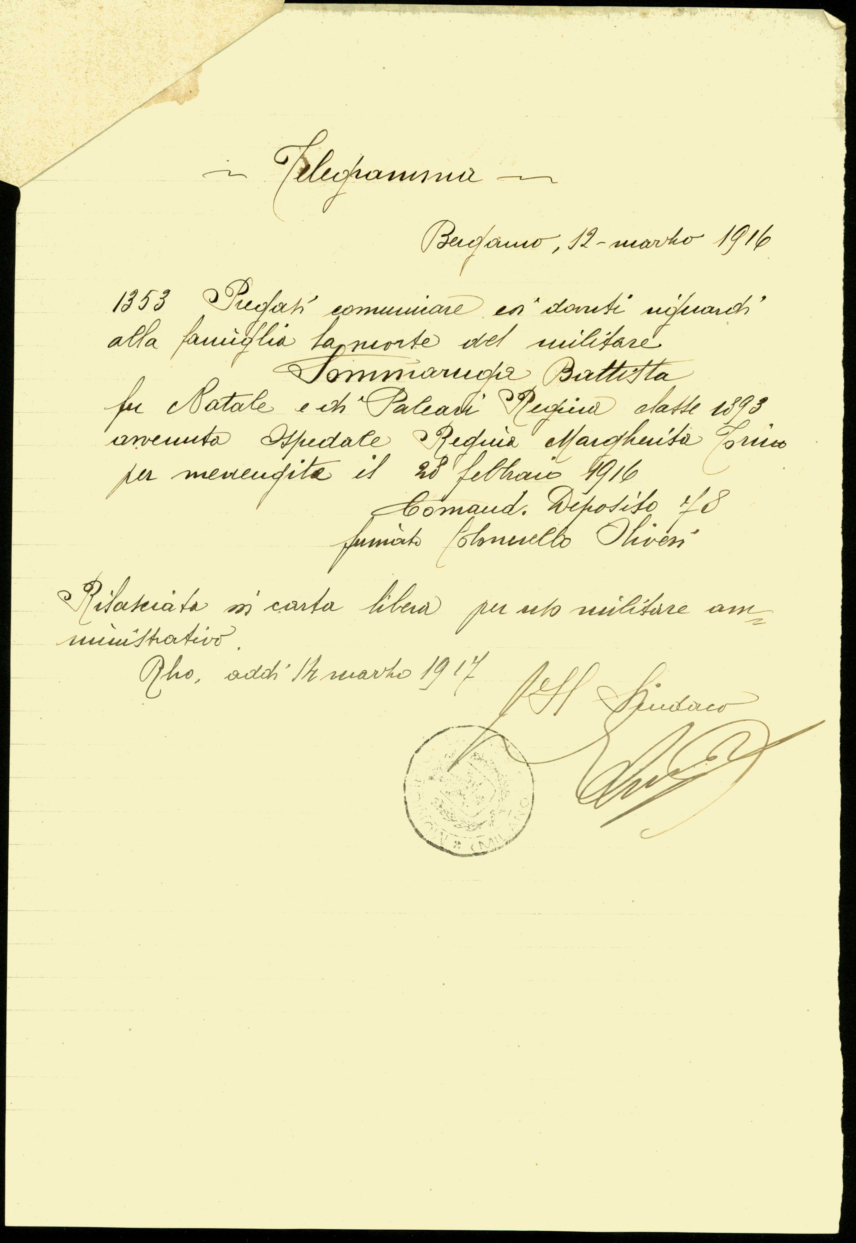 Istituto per la Storia del Risorgimento Italian.../Fondo caduti prima guerra mondiale/Sole Fortunato - Sorgente Pasquale/Sommaruga Battista, Rho (Milano)