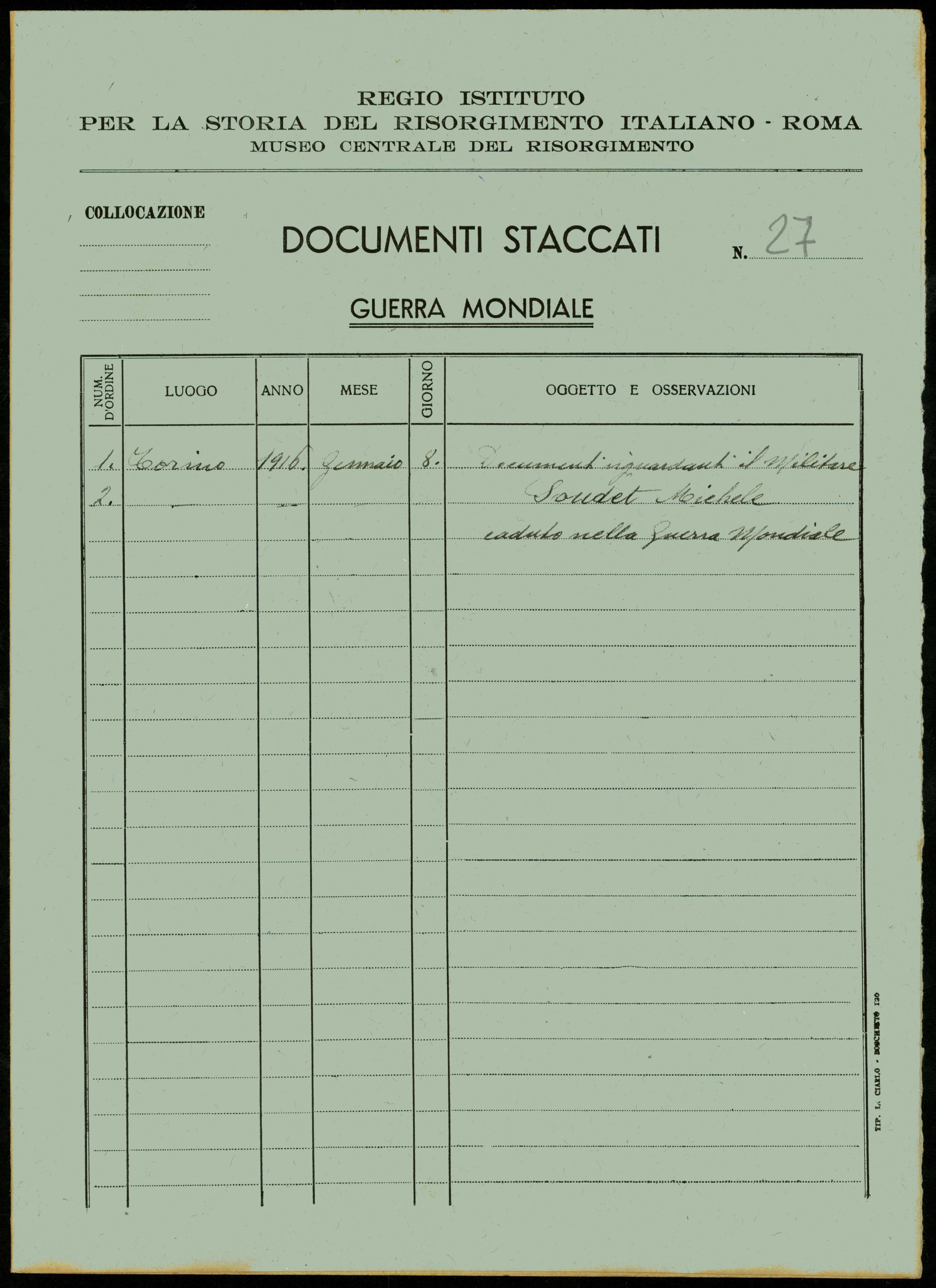 | Percorso: Istituto per la Storia del Risorgimento Italian.../Fondo caduti prima guerra mondiale/Soria Domenico - Spairani Giovanni Battista/Soudet Michele, Valpelline (Torino) | |||||||||||