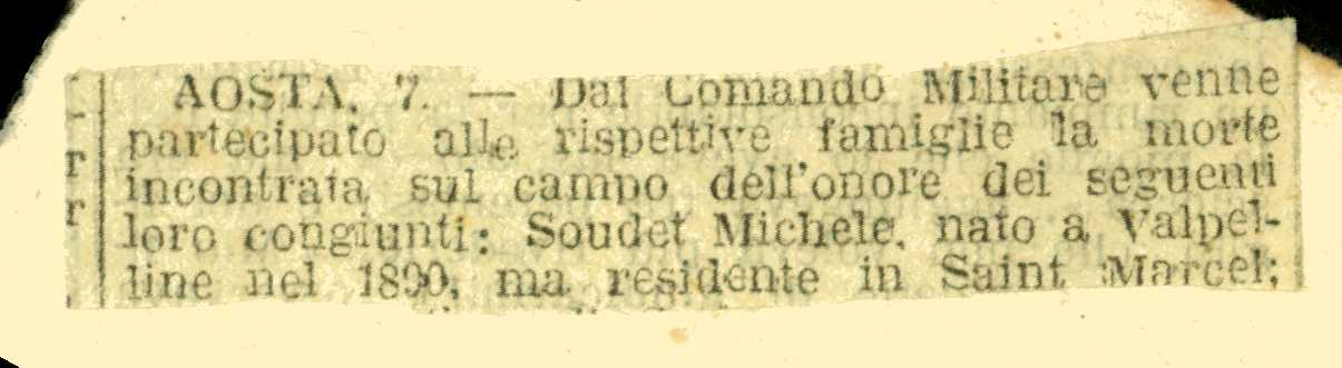 | Percorso: Istituto per la Storia del Risorgimento Italian.../Fondo caduti prima guerra mondiale/Soria Domenico - Spairani Giovanni Battista/Soudet Michele, Valpelline (Torino) | |||||||||||