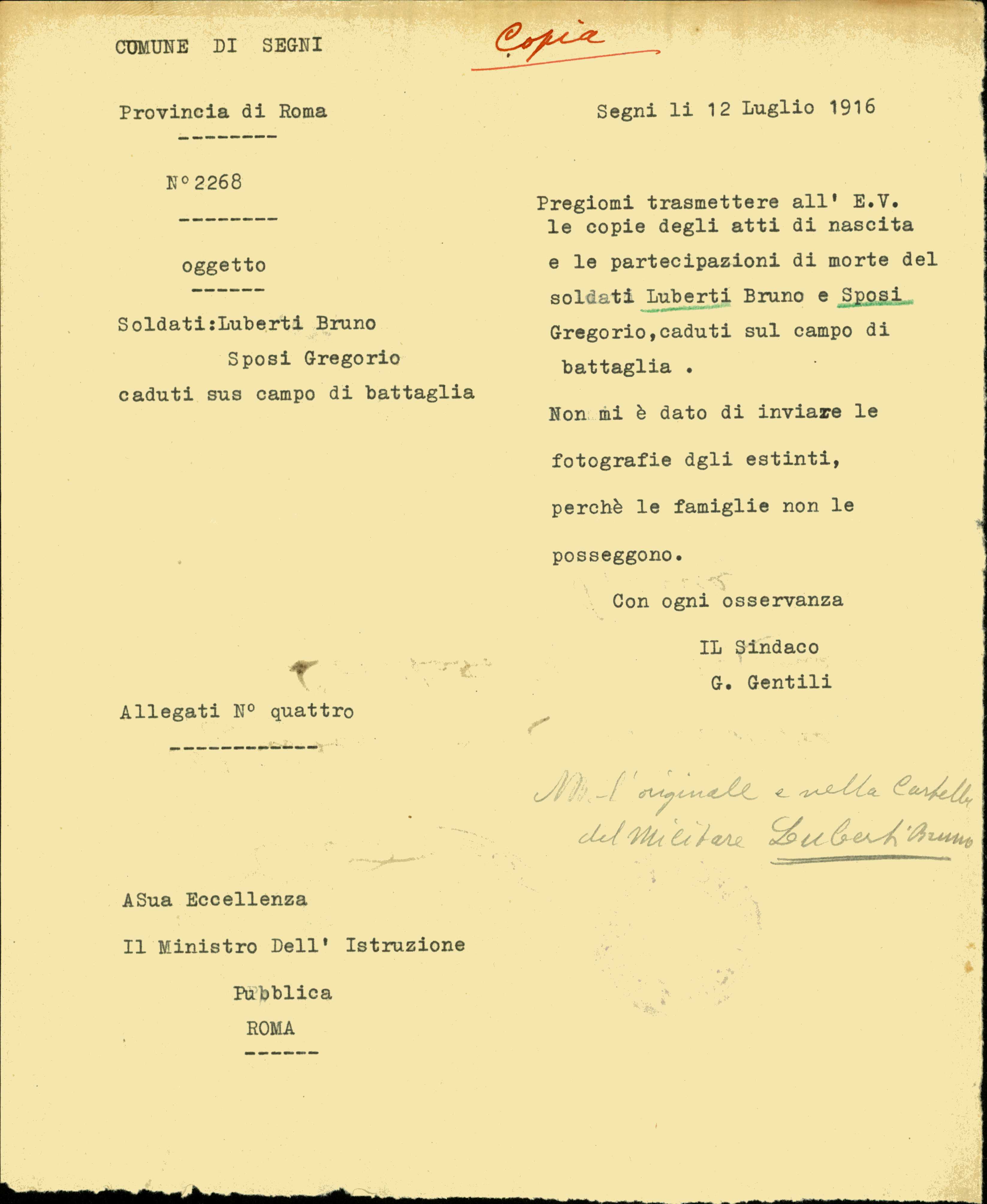 | Percorso: Istituto per la Storia del Risorgimento Italian.../Fondo caduti prima guerra mondiale/Spina Angelo - Squillari Giuseppe/Sportoletti Aldo, Segni Luberti Bruno, Segni | |||||||||||