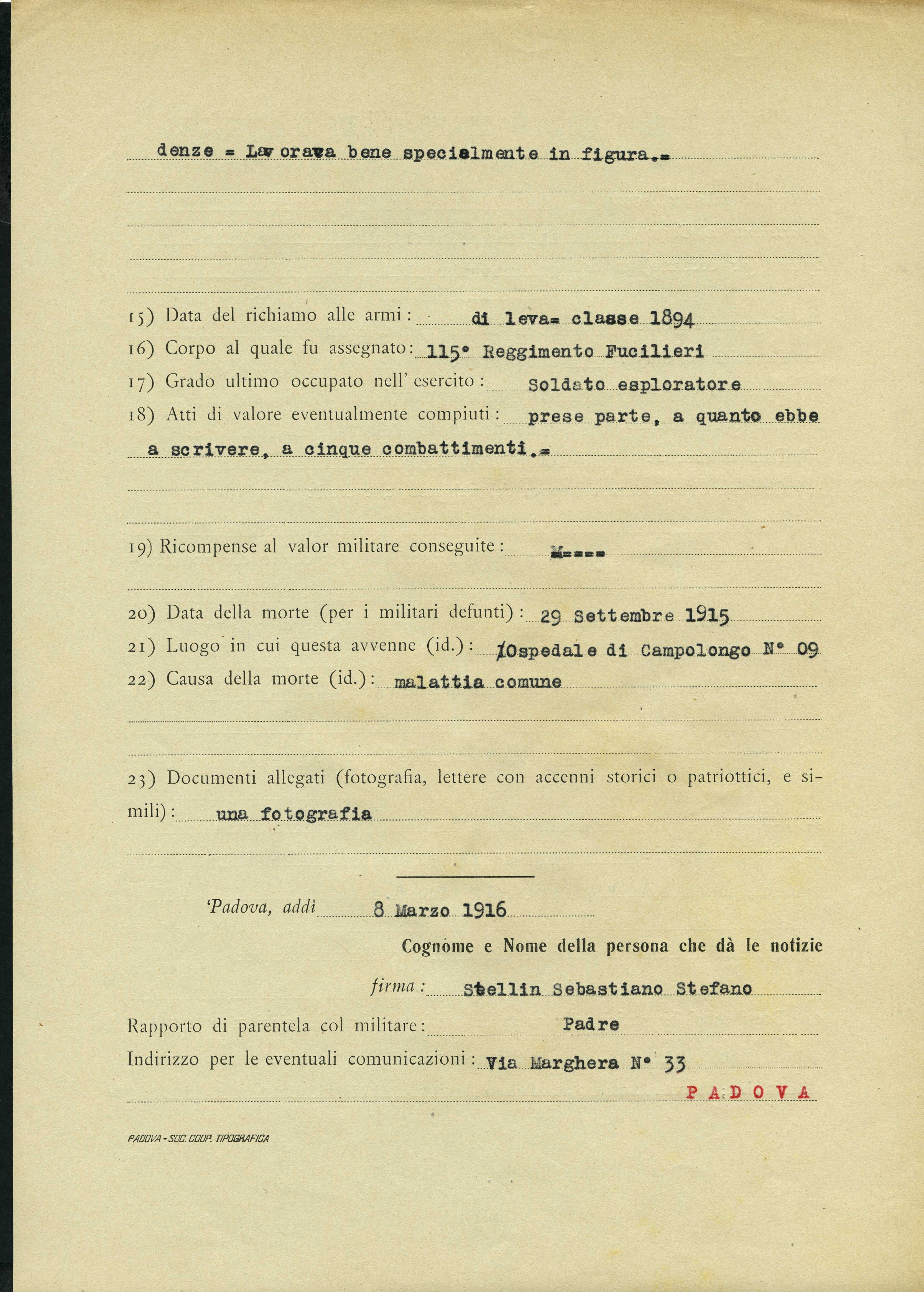 | Percorso: Istituto per la Storia del Risorgimento Italian.../Fondo caduti prima guerra mondiale/Stefanini Bernardino - Stoppini Vittorio/Stellin Giovanni Francesco, Bassanello di Padov... | |||||||||||