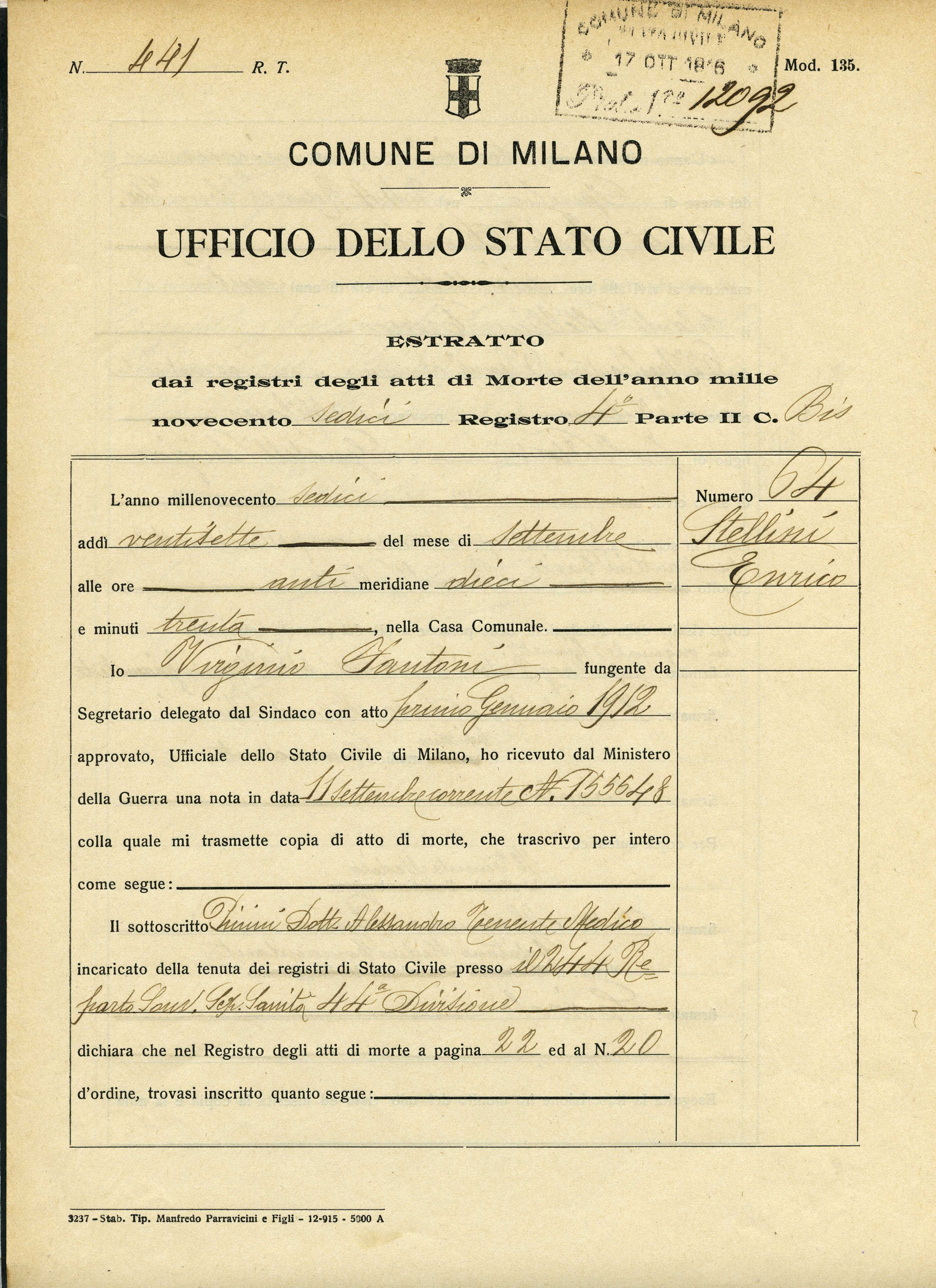 Istituto per la Storia del Risorgimento Italian.../Fondo caduti prima guerra mondiale/Stefanini Bernardino - Stoppini Vittorio/Stellini Enrico, Milano