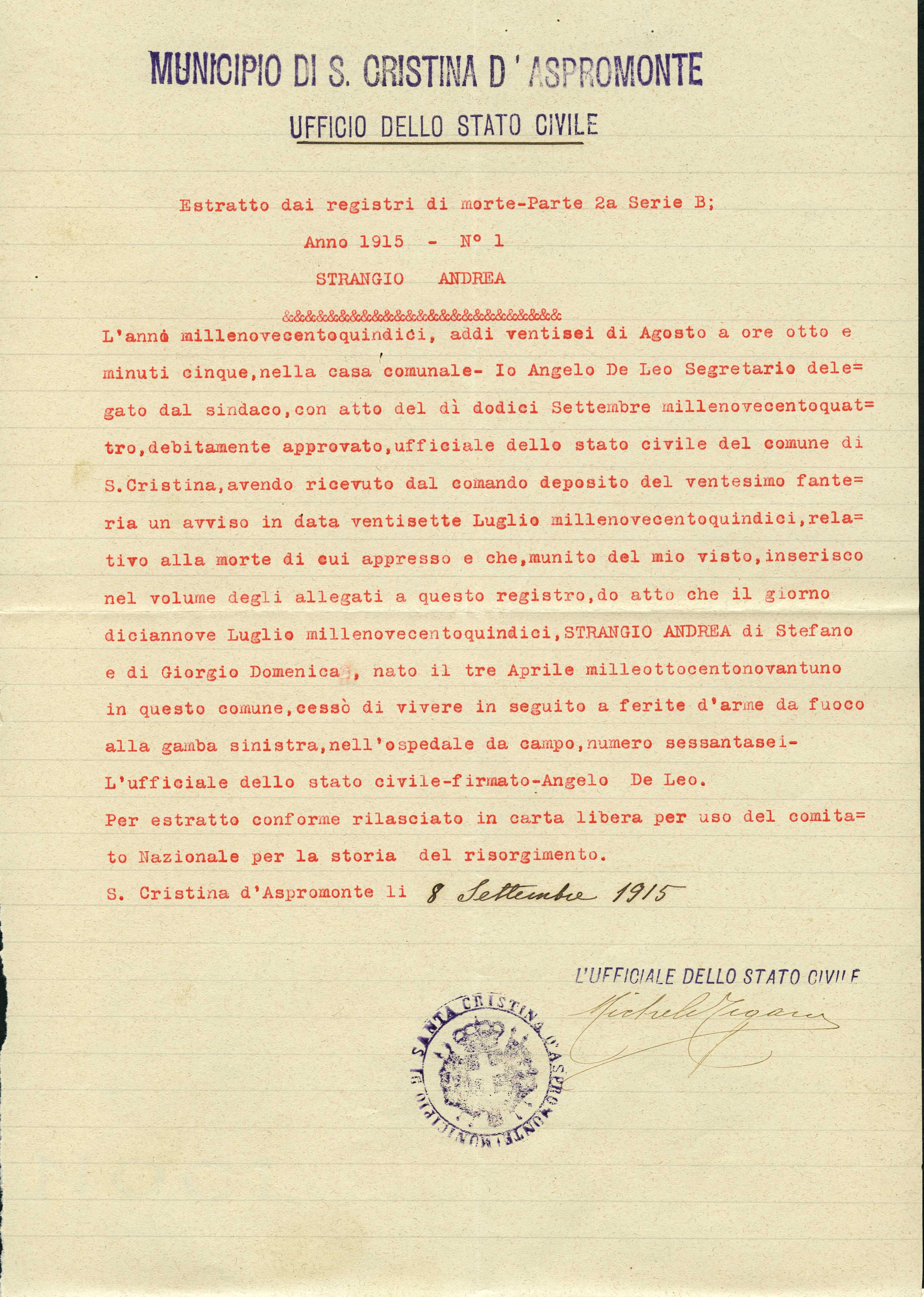 | Percorso: Istituto per la Storia del Risorgimento Italian.../Fondo caduti prima guerra mondiale/Storace Attilio - Struzzini Ernesto/Strangio Andrea, S. Cristina d'Aspromonte (Regg... | |||||||||||