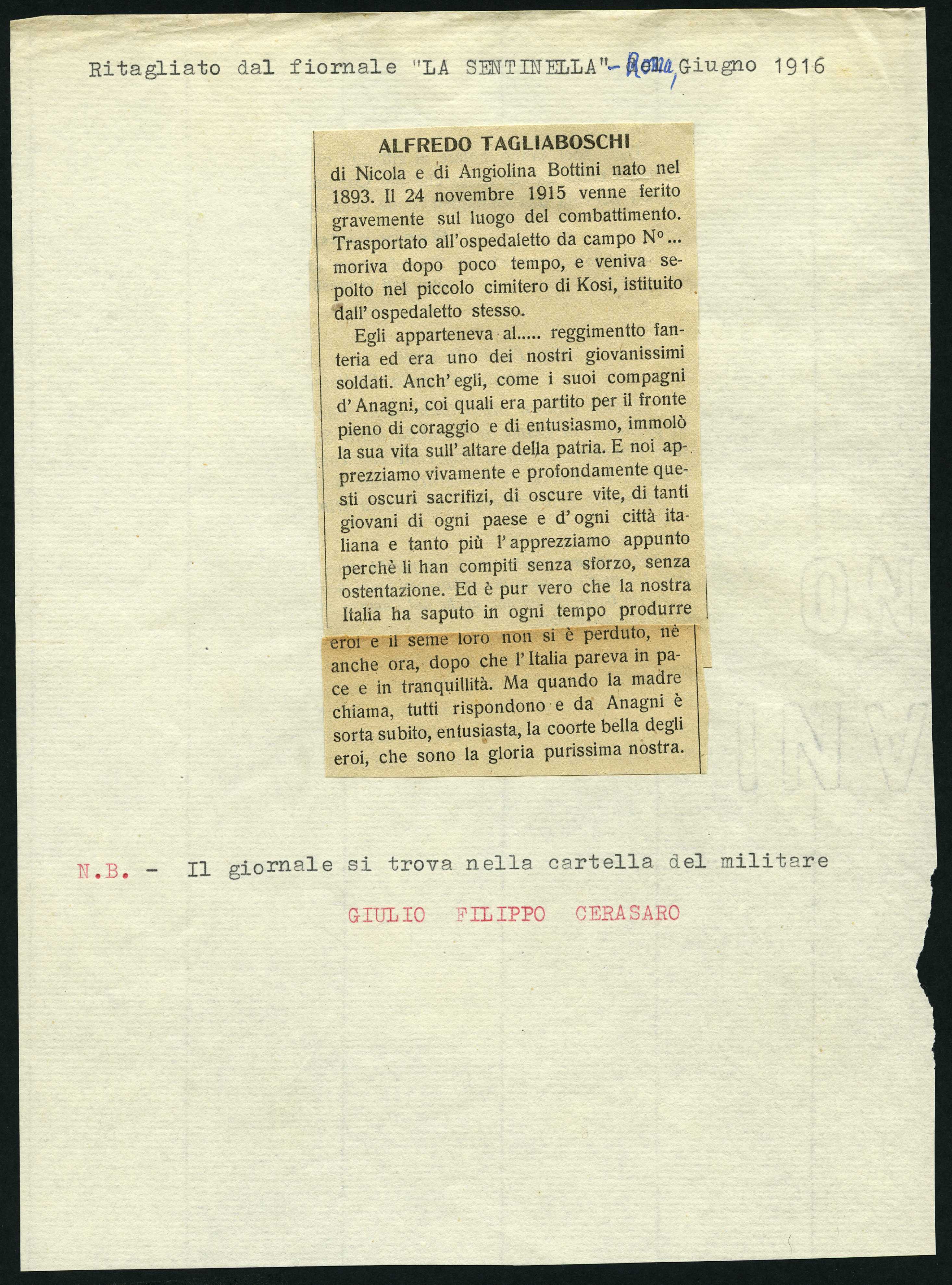 Istituto per la Storia del Risorgimento Italian.../Fondo caduti prima guerra mondiale/Tabacco Giovanni - Tagni Luigi /Tagliaboschi Alfredo