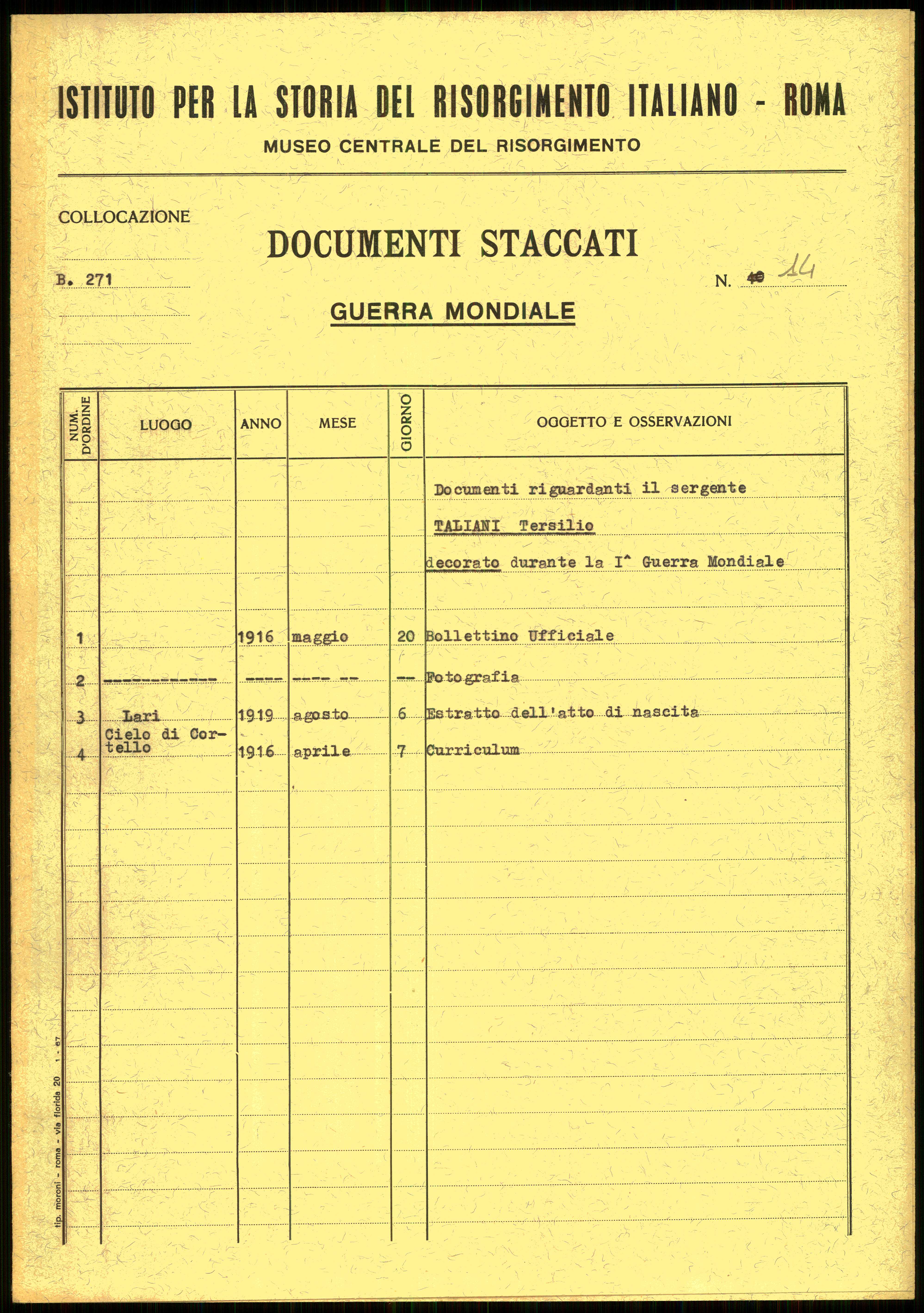 Istituto per la Storia del Risorgimento Italian.../Fondo caduti prima guerra mondiale/Taibi Giuseppe - Tapparo Francesco/Taliani Tersilio, Lari (Pisa)