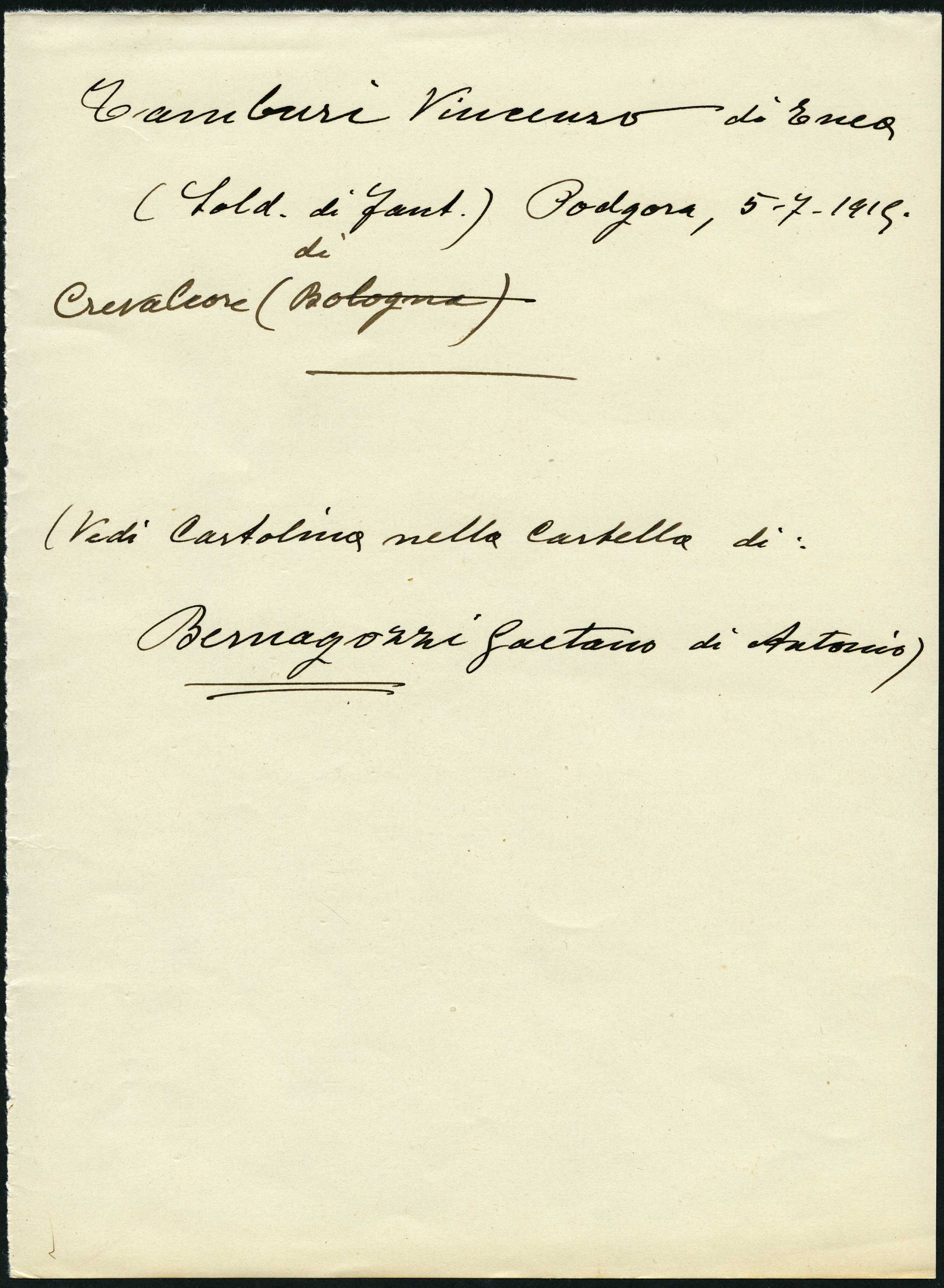 | Percorso: Istituto per la Storia del Risorgimento Italian.../Fondo caduti prima guerra mondiale/Taibi Giuseppe - Tapparo Francesco/Tamburi Vincenzo, Crevalcore (Bologna) | |||||||||||