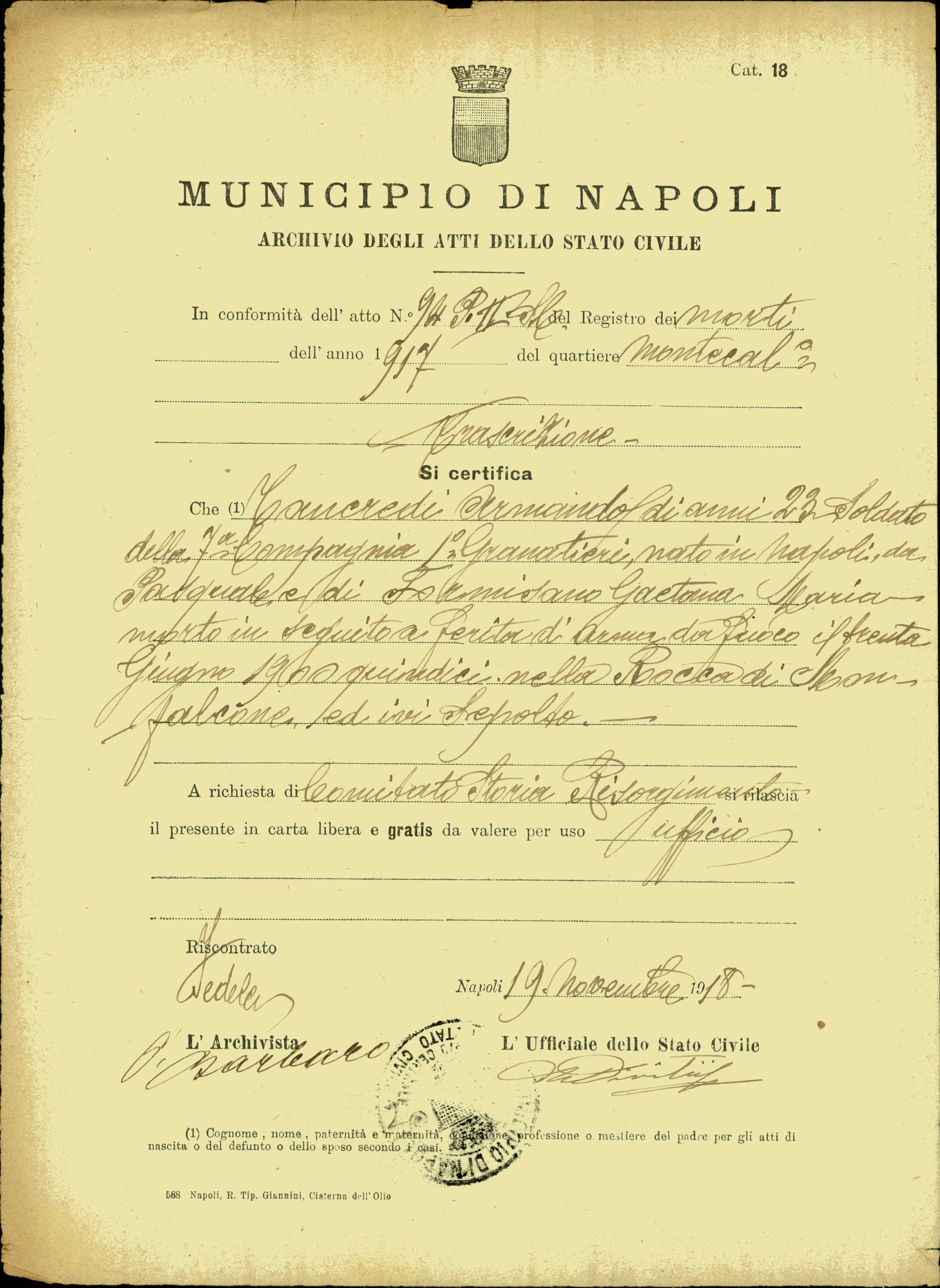 Istituto per la Storia del Risorgimento Italian.../Fondo caduti prima guerra mondiale/Taibi Giuseppe - Tapparo Francesco/Tancredi Armando, Napoli
