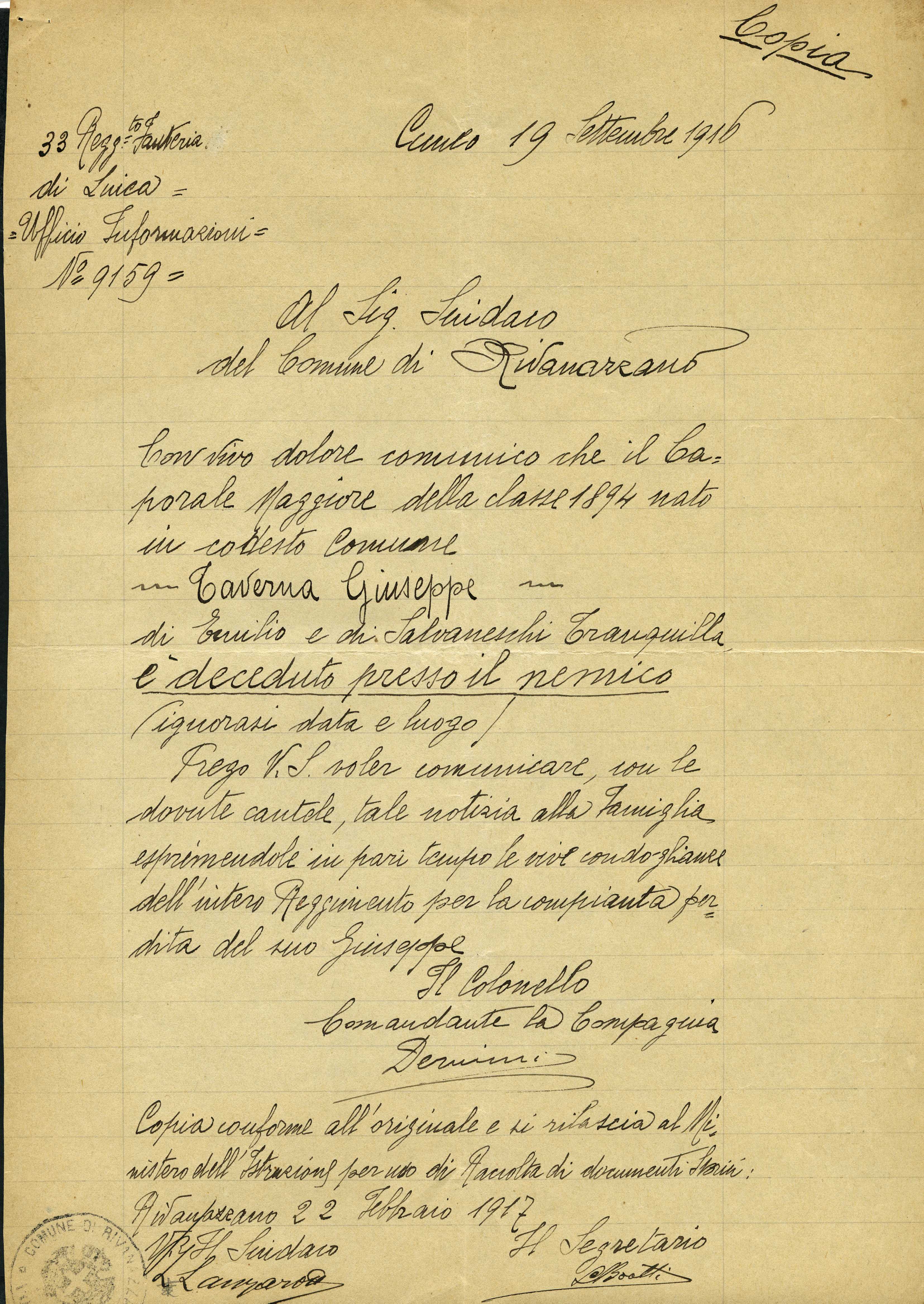 Istituto per la Storia del Risorgimento Italian.../Fondo caduti prima guerra mondiale/Tassi Ciro - Tegani Raffaello/Taverna Giuseppe, Rivanazzano