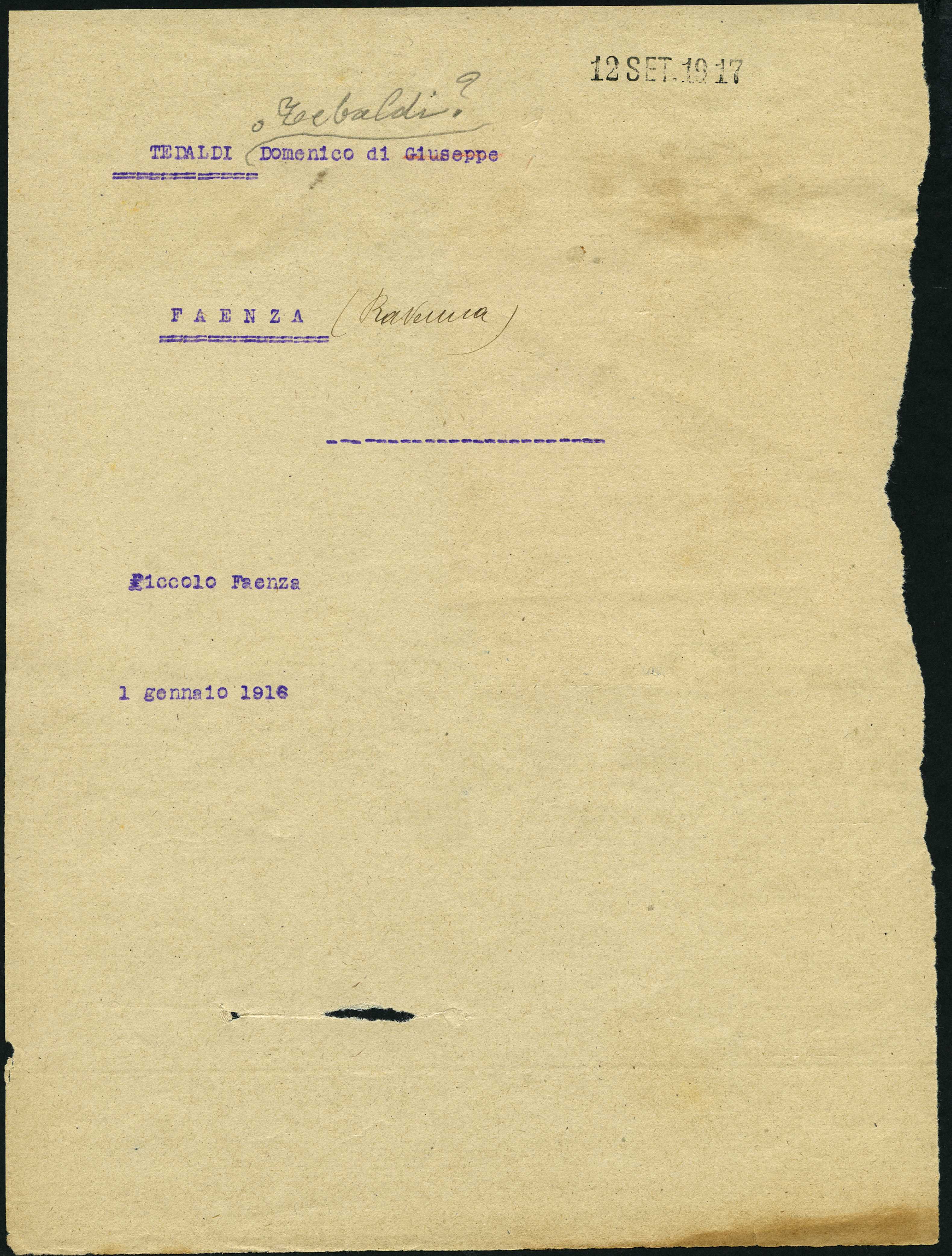 Istituto per la Storia del Risorgimento Italian.../Fondo caduti prima guerra mondiale/Tassi Ciro - Tegani Raffaello/Tebaldi Domenico, Faenza (Ravenna)