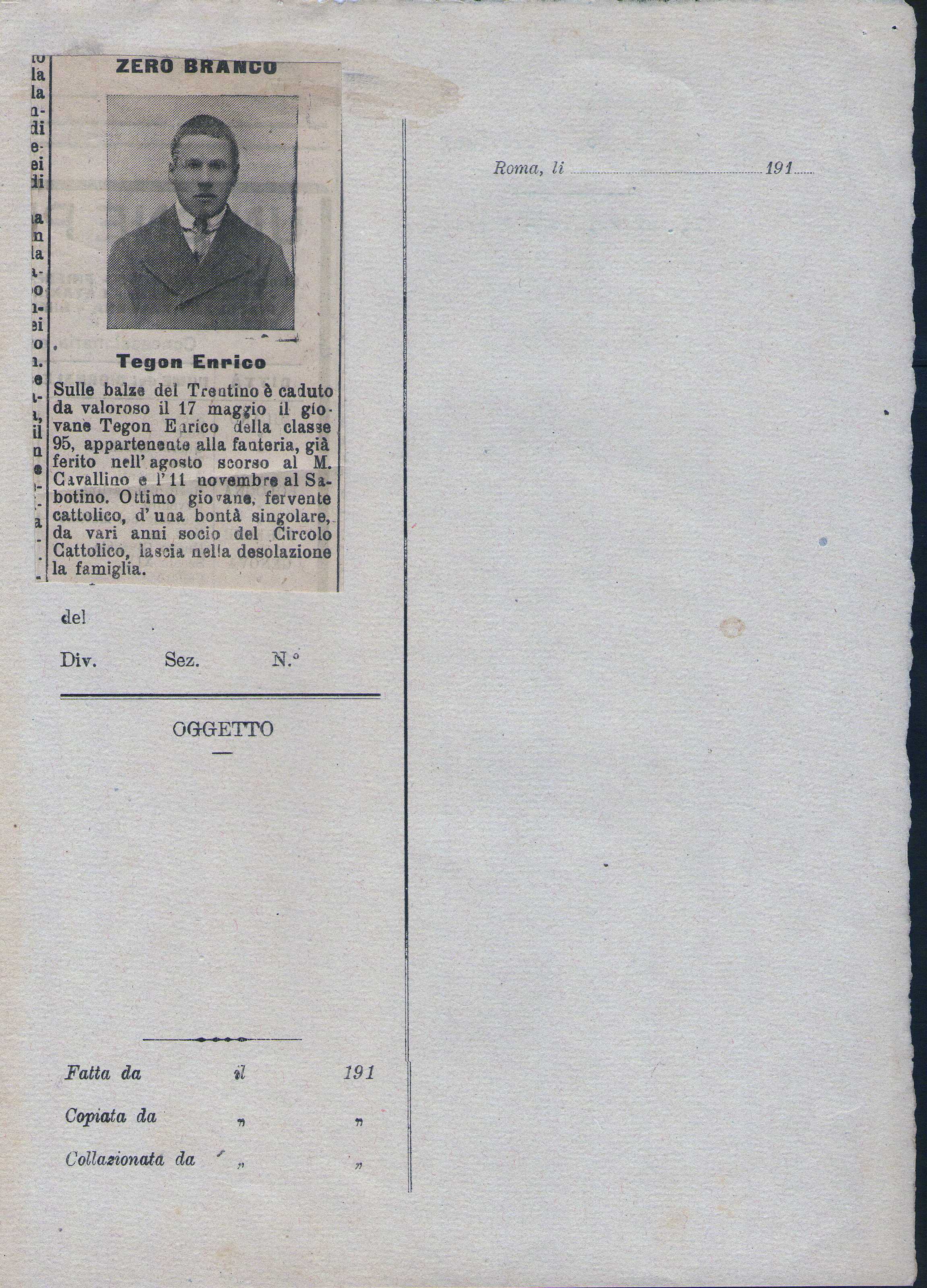 Istituto per la Storia del Risorgimento Italian.../Fondo caduti prima guerra mondiale/Tego Arturo - Terranova Ignazio/Tegon Enrico, Zero Branco (Treviso)