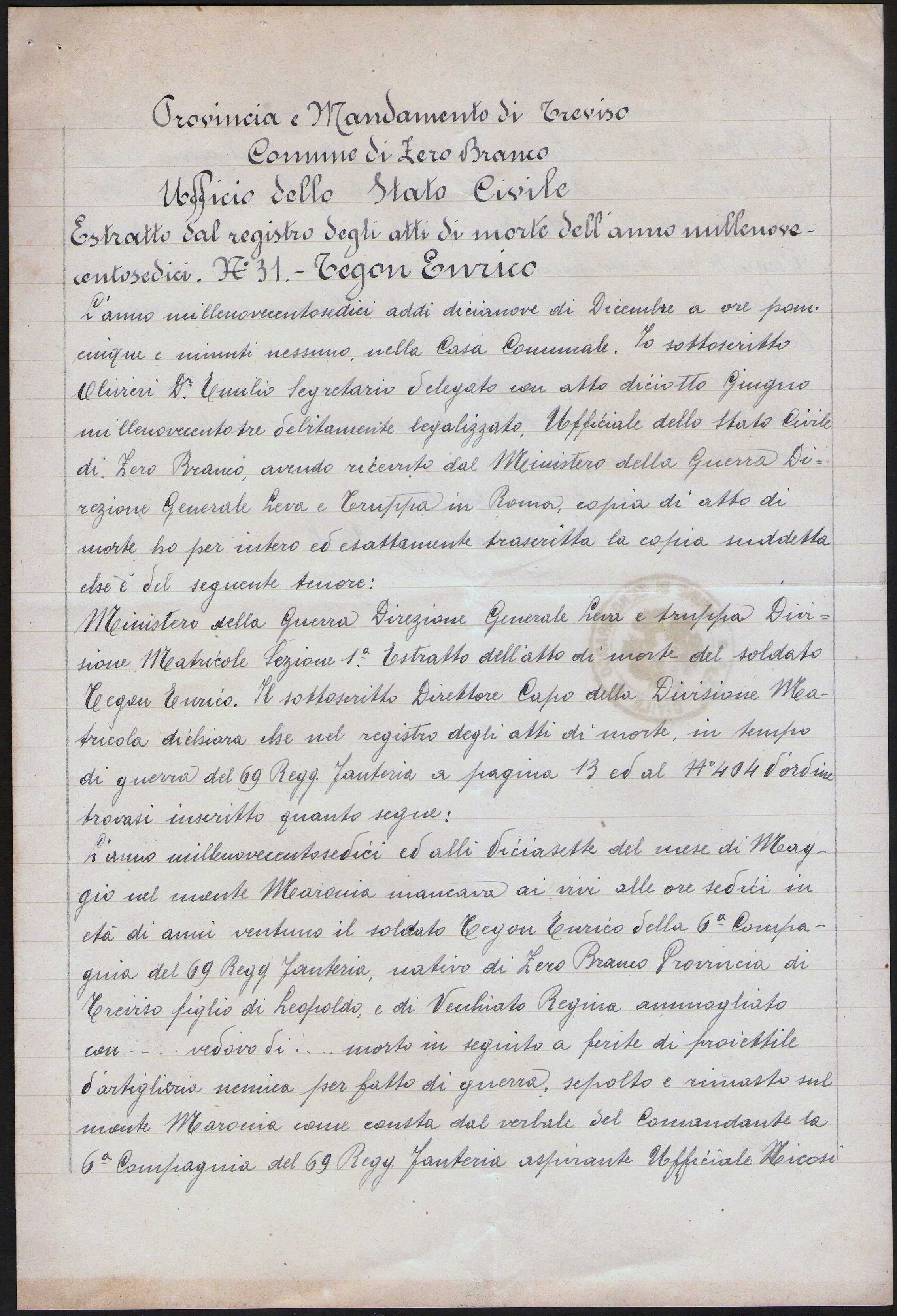 Istituto per la Storia del Risorgimento Italian.../Fondo caduti prima guerra mondiale/Tego Arturo - Terranova Ignazio/Tegon Enrico, Zero Branco (Treviso)