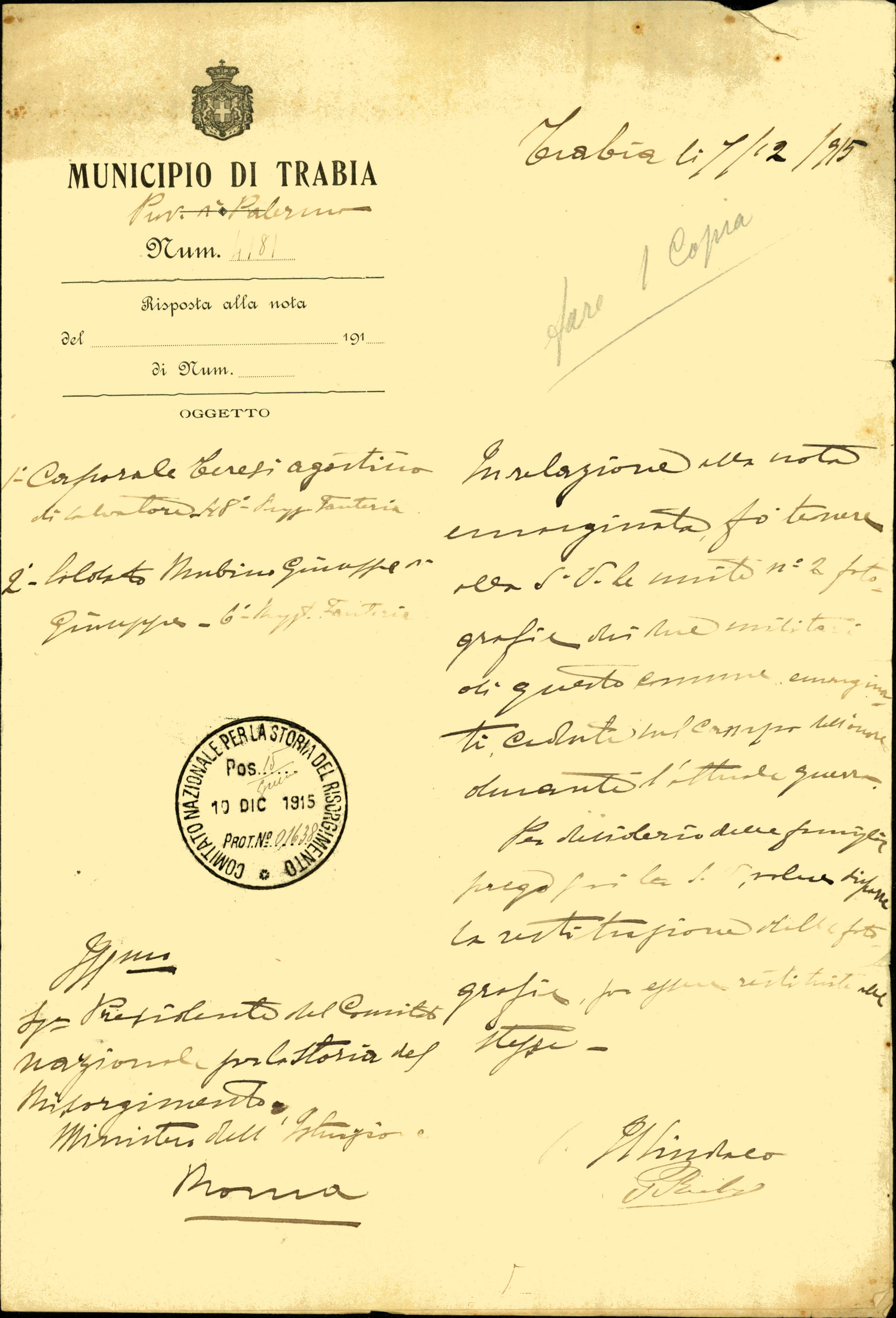Istituto per la Storia del Risorgimento Italian.../Fondo caduti prima guerra mondiale/Tego Arturo - Terranova Ignazio/Teresi Agostino, Trabia (Palermo)